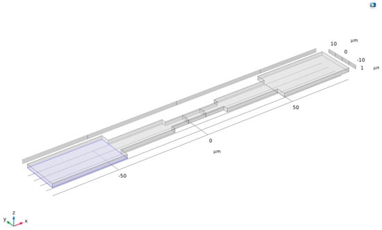 First, a rectangular union was drawn on a plane as the basic shape of the channel. Then, the extrusion function was used to stretch this union upward by 2 μm, constructing it into a three-dimensional channel, as shown in Figure 4.