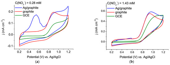(a,b) Cyclic voltammograms of graphite, modified Ag-particles, ISEM-3 graphite, and glassy-carbon electrode (GCE) in the presence of 0.28 mM and 1.43 mM nitrite (buffer system at pH 3 with 50 mV s−1 scan rate).