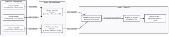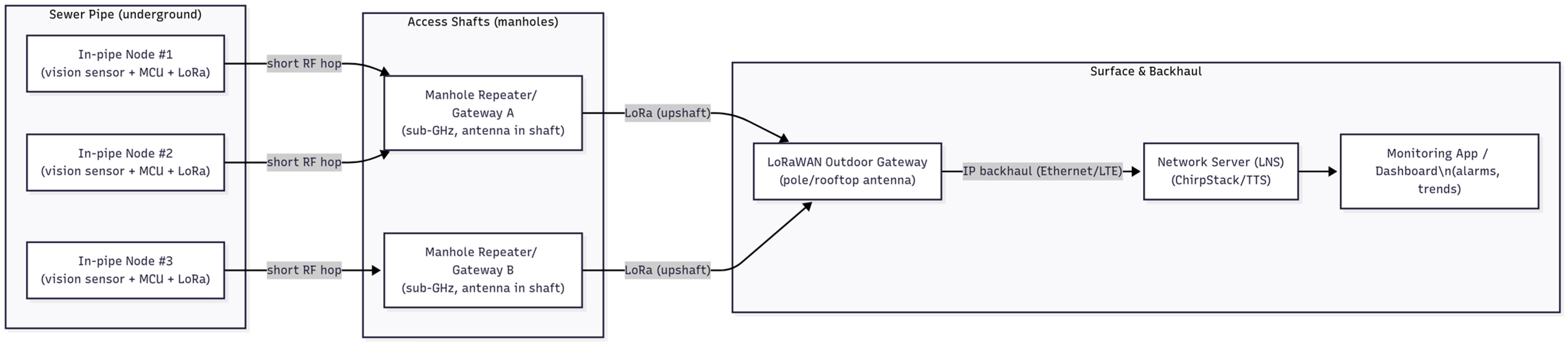 An LoRa network can work in sewer pipelines, but only under certain conditions. Signals do not travel well through soil, concrete, and water, so sensors placed deep inside pipes usually cannot talk directly to a surface gateway. The common solution is to install repeaters or gateways in manholes; the in-pipe sensor sends a short LoRa signal to the nearest manhole unit, and that unit forwards the data up to the surface gateway, which then relays it to the cloud or a dashboard. In practice, this means LoRa is reliable for short underground hops (10–50 m) and when manholes are used as communication points, but it does not work well over long stretches of buried pipe without access shafts.