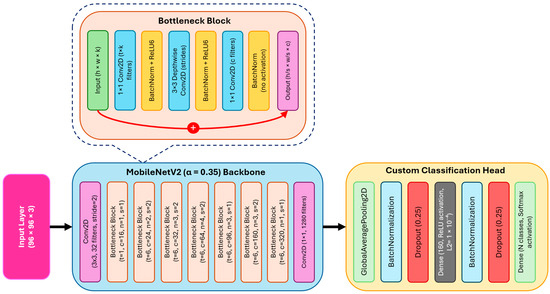 The classification network is based on MobileNetV2 with a reduced width multiplier (α = 0.35) and input resolution of 96 × 96 pixels to keep the model lightweight for embedded deployment. The backbone uses depthwise separable convolutions and inverted residual blocks, which significantly reduce parameter count while retaining representational power. The model architecture is shown in Figure 5.