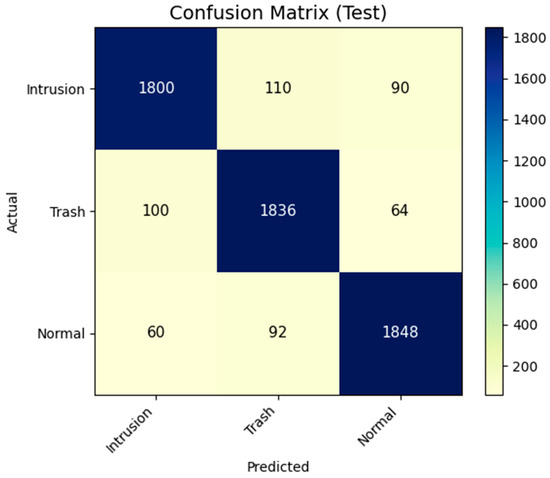 The confusion matrix (Figure 6) summarizes classification outcomes for the three classes (intrusion, trash, normal). Most predictions were correct, with only a small fraction of misclassifications, primarily between intrusion and trash due to overlapping visual features.