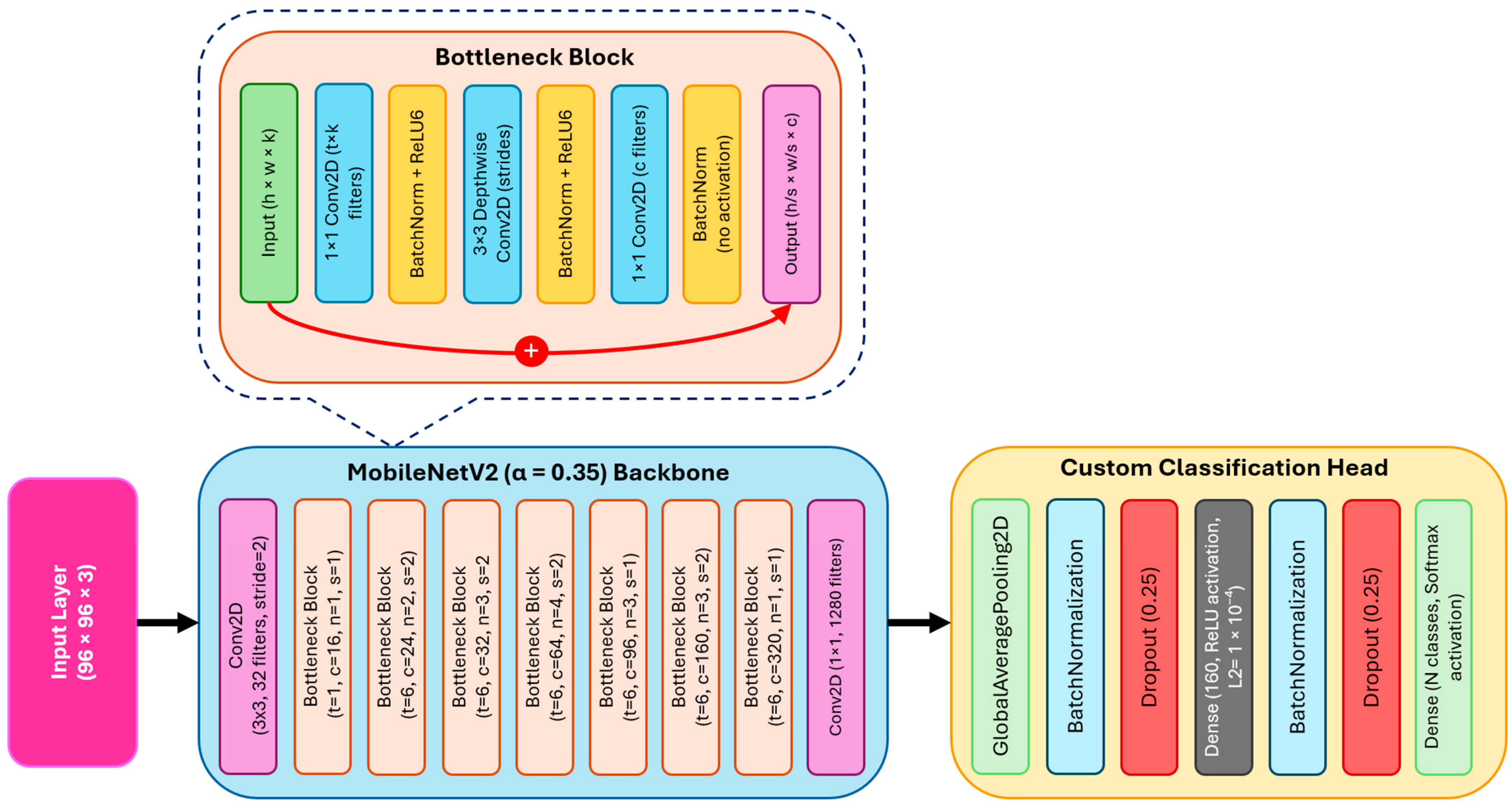 The classification network is based on MobileNetV2 with a reduced width multiplier (α = 0.35) and input resolution of 96 × 96 pixels to keep the model lightweight for embedded deployment. The backbone uses depthwise separable convolutions and inverted residual blocks, which significantly reduce parameter count while retaining representational power. The model architecture is shown in