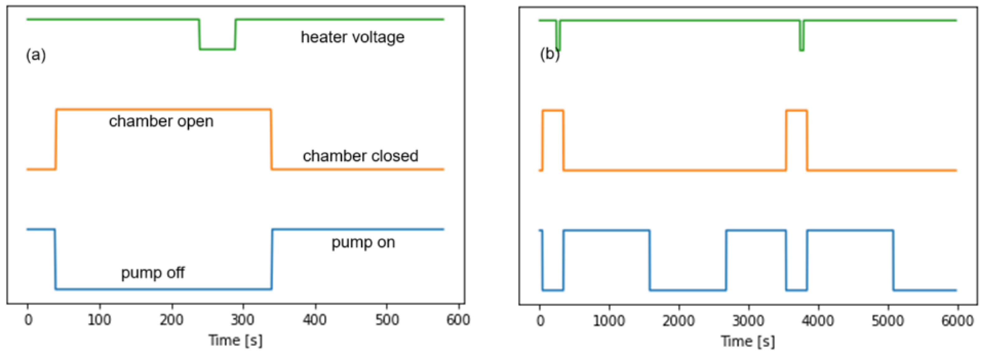 Figure 6b), during which the sensor chamber remained closed but the hydraulic pump was turned off. During that delay, sensors were heated with nominal heater voltage as recommended by the manufacturer.