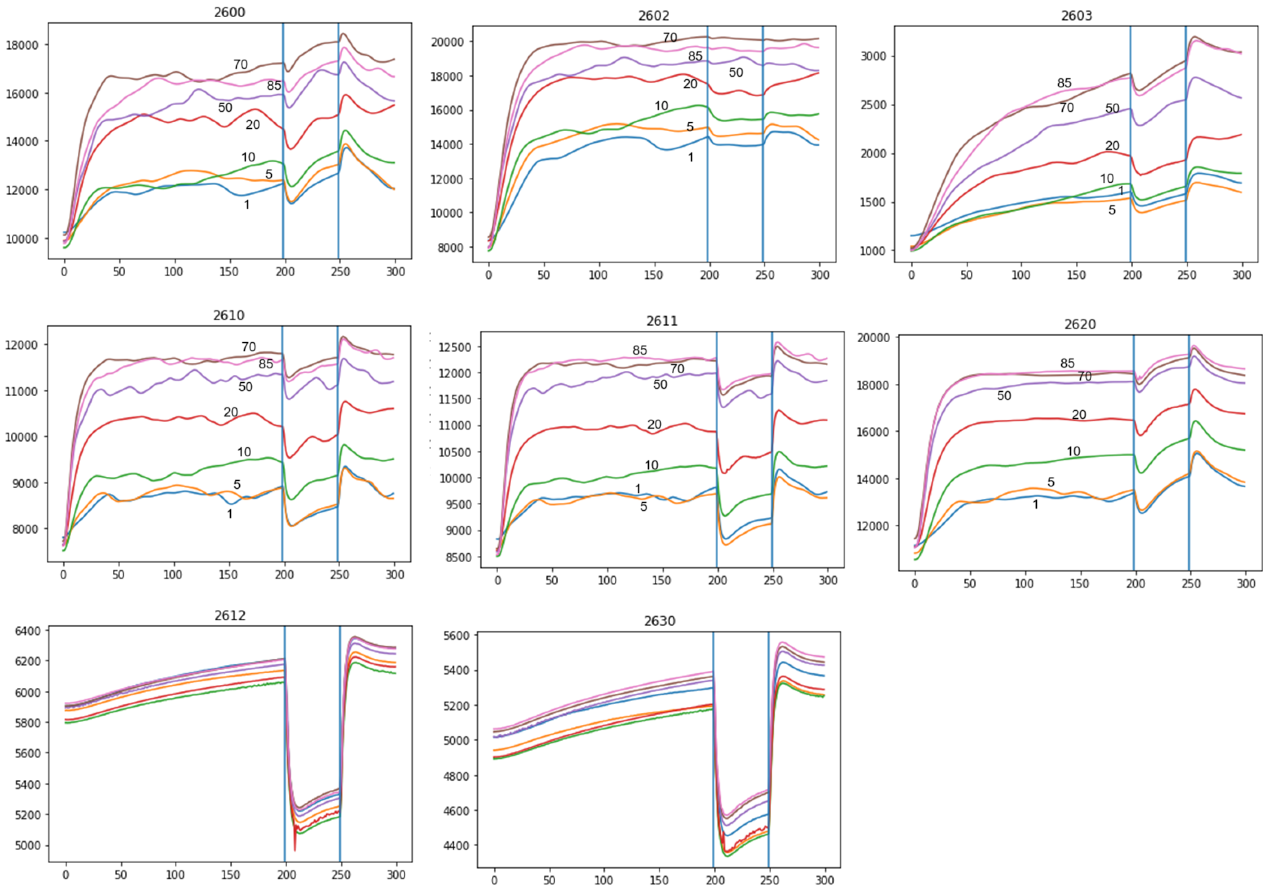 Another observation is that we can observe here a trend in registered sensor response over time of the experiment. Sensor responses in later repetitions of measurement cycles are stronger, which indicates the presence of some gases to which gas sensors react.