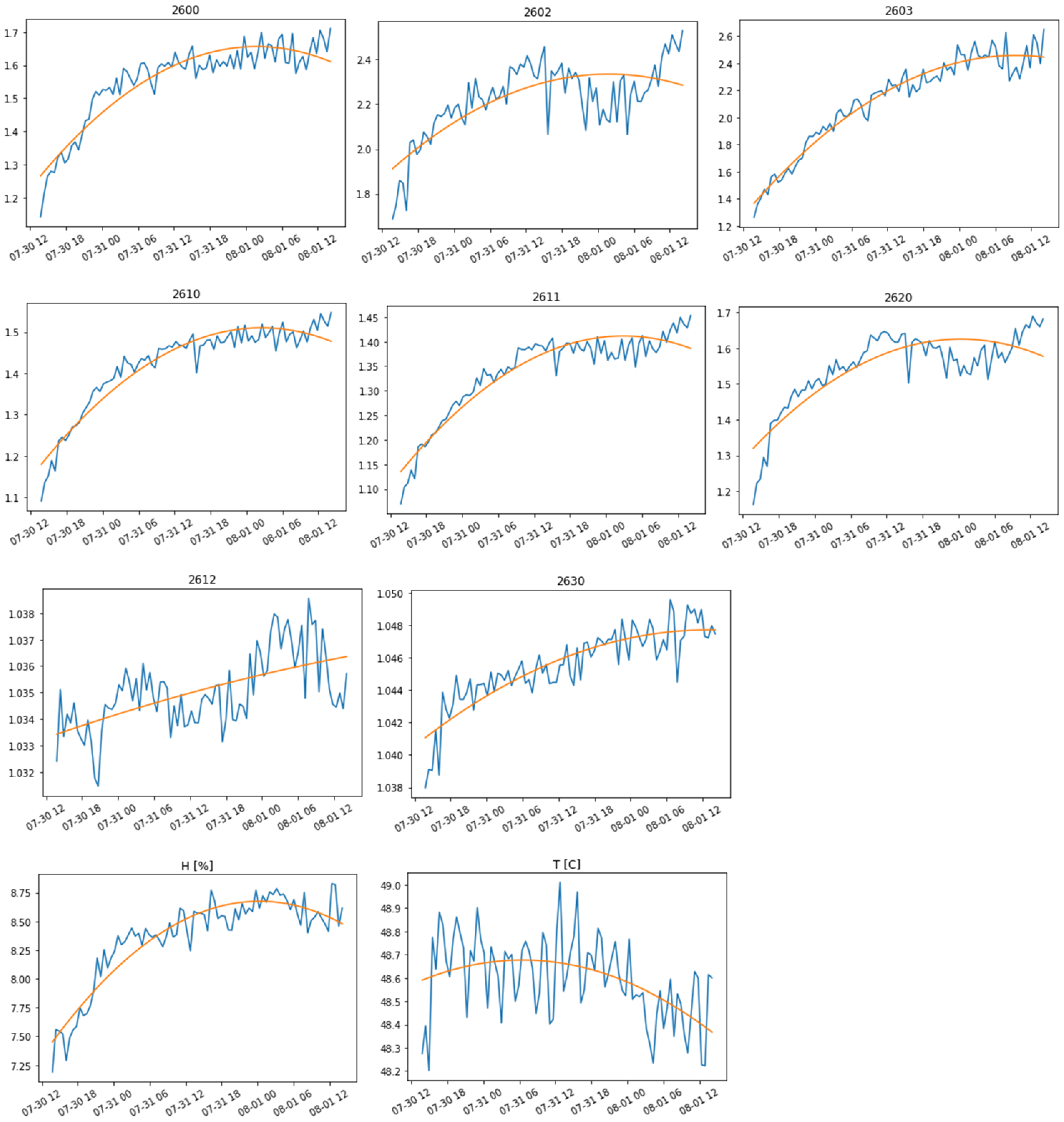 Besides the gas sensors’ response, we also monitored temperature and humidity in the vicinity of the sensors. Due to heat generation by sensor heaters, the measured temperature was relatively high, about 48 °C, but also quite stable, with registered changes in the order of less than one Celsius degree.