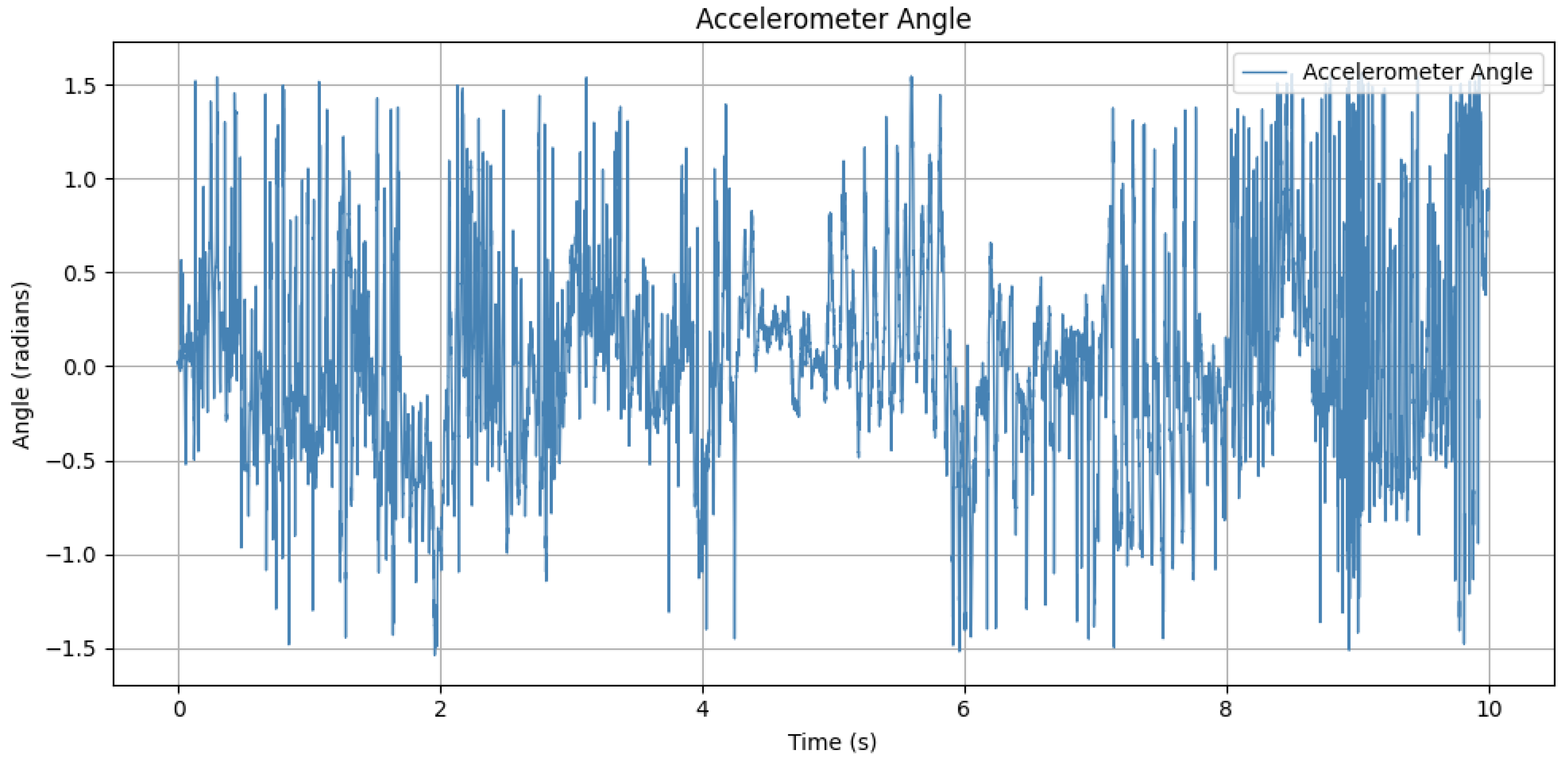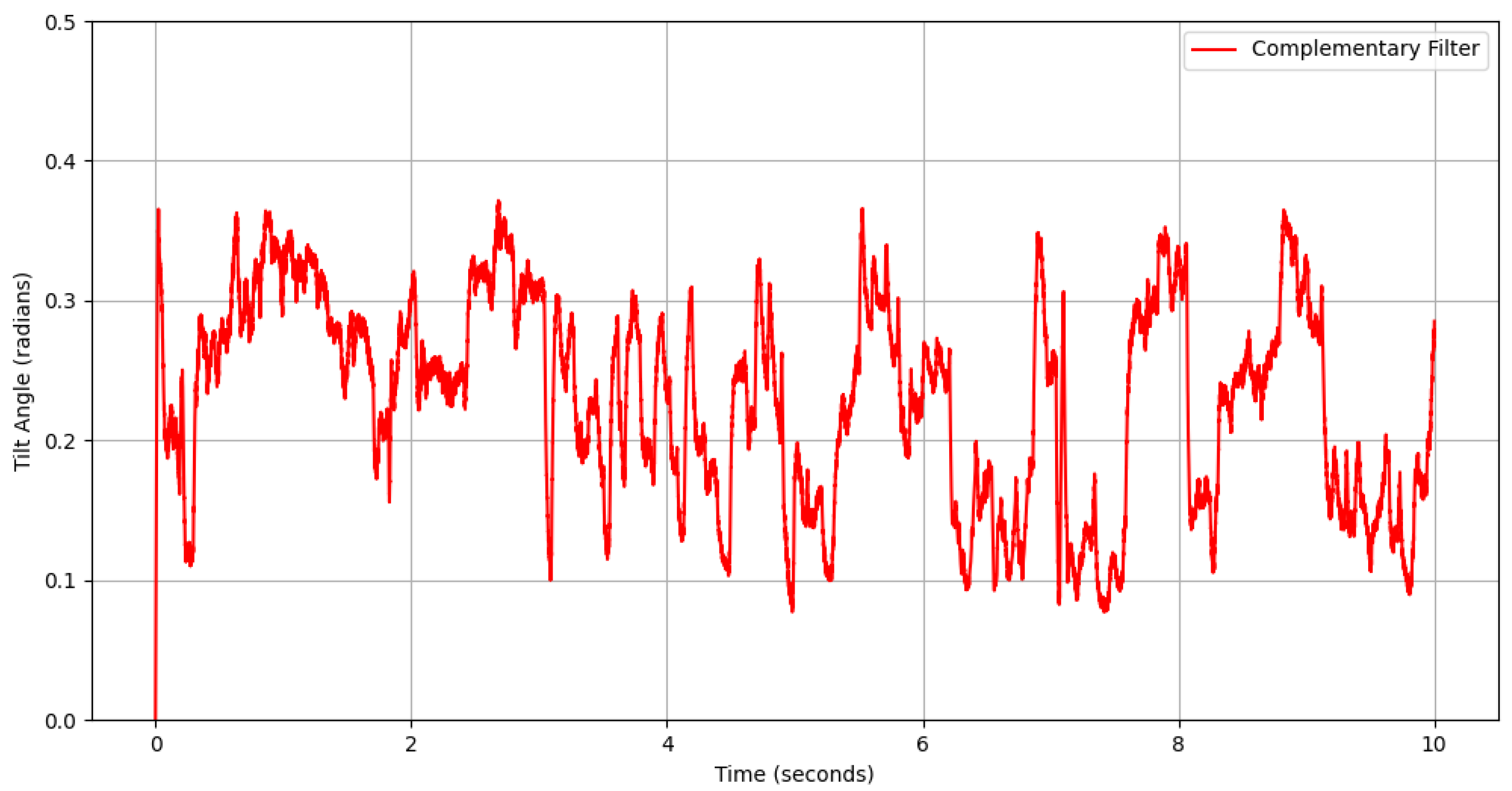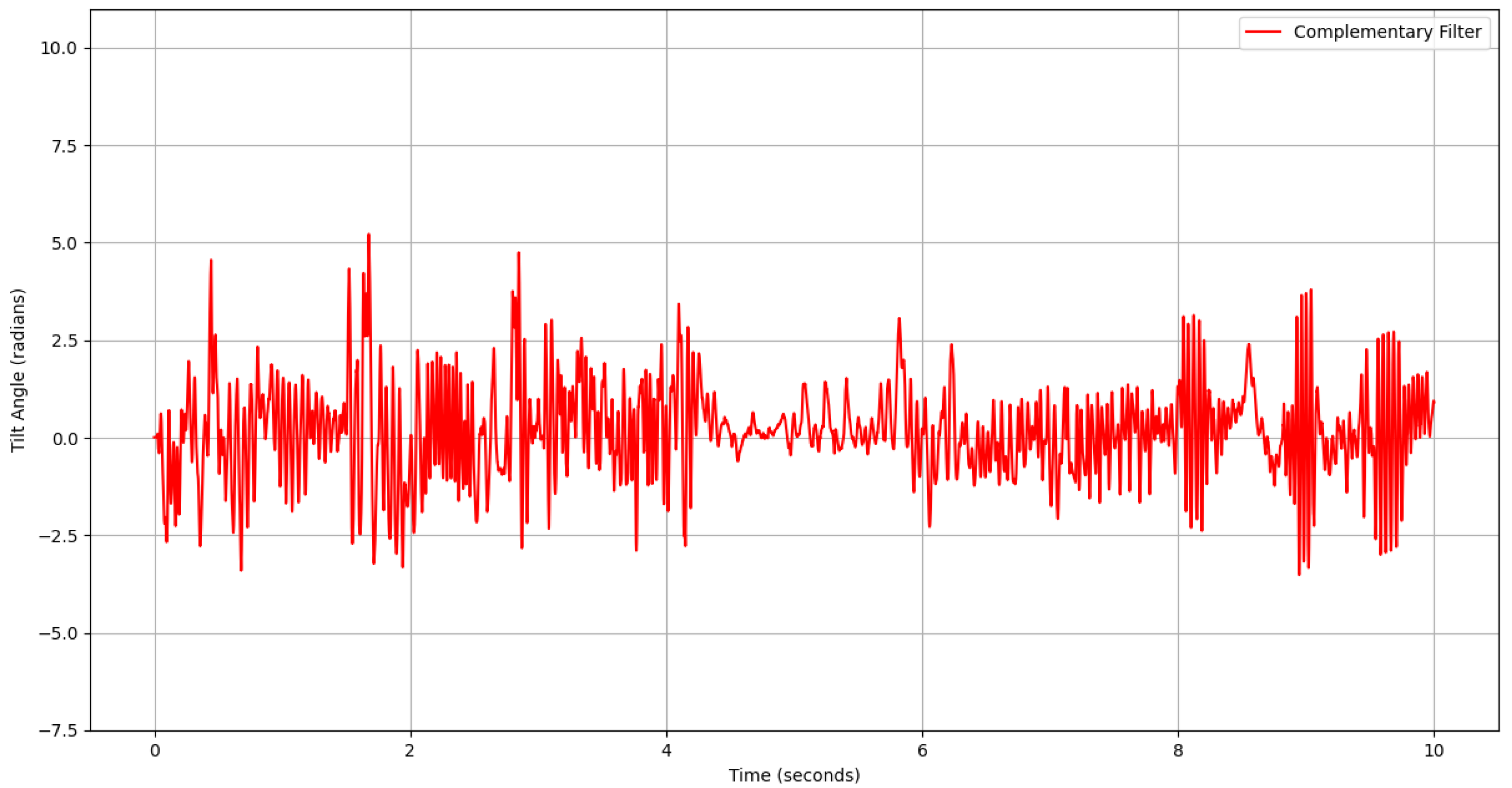 The low-pass filter smooths brief fluctuations by gradually accumulating changes over time. For example, if an accelerometer reading jumps to 10 degrees, the complementary filter ensures a gradual rise without spikes, depending on filter parameters and sampling rate. Meanwhile, the high-pass filter counteracts gyroscope drift by allowing for short-duration signals while filtering long-term variations, ensuring accurate angle estimation [
