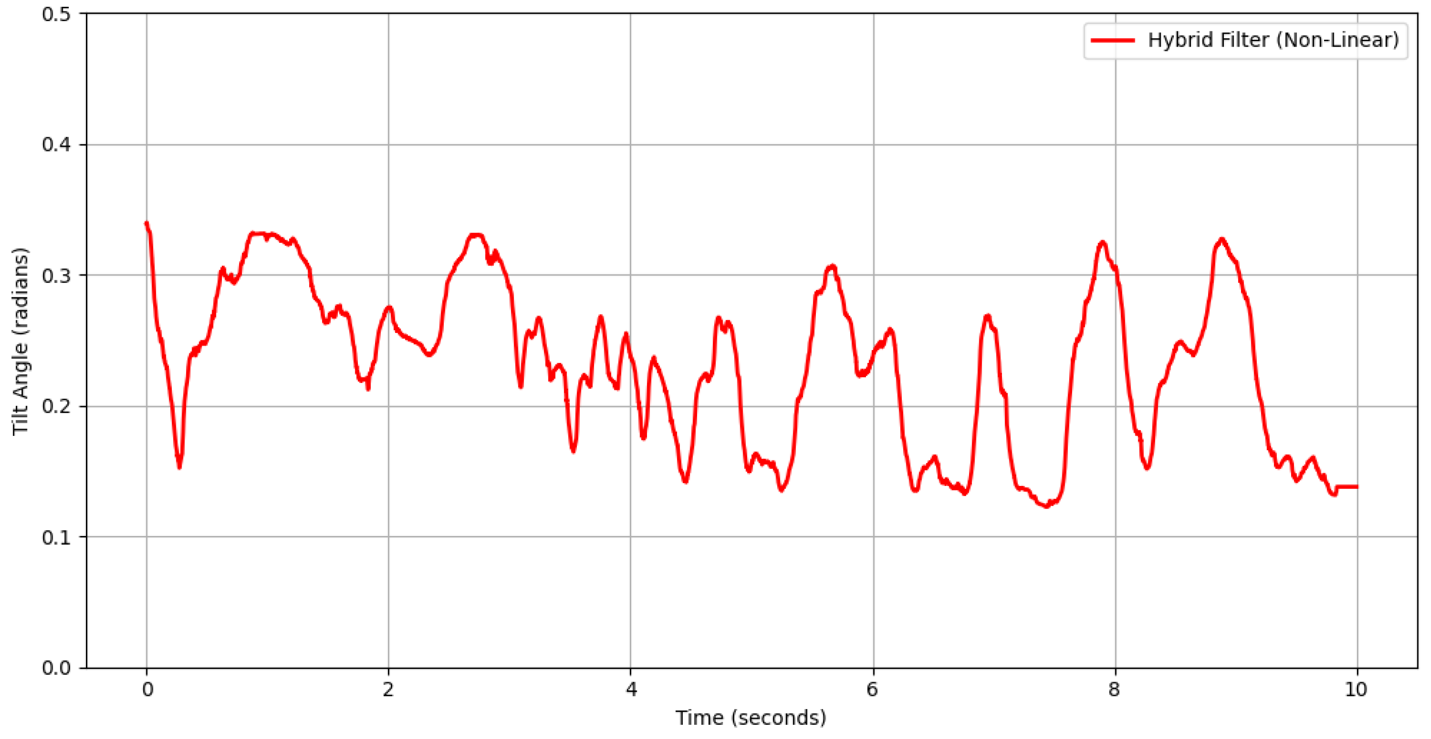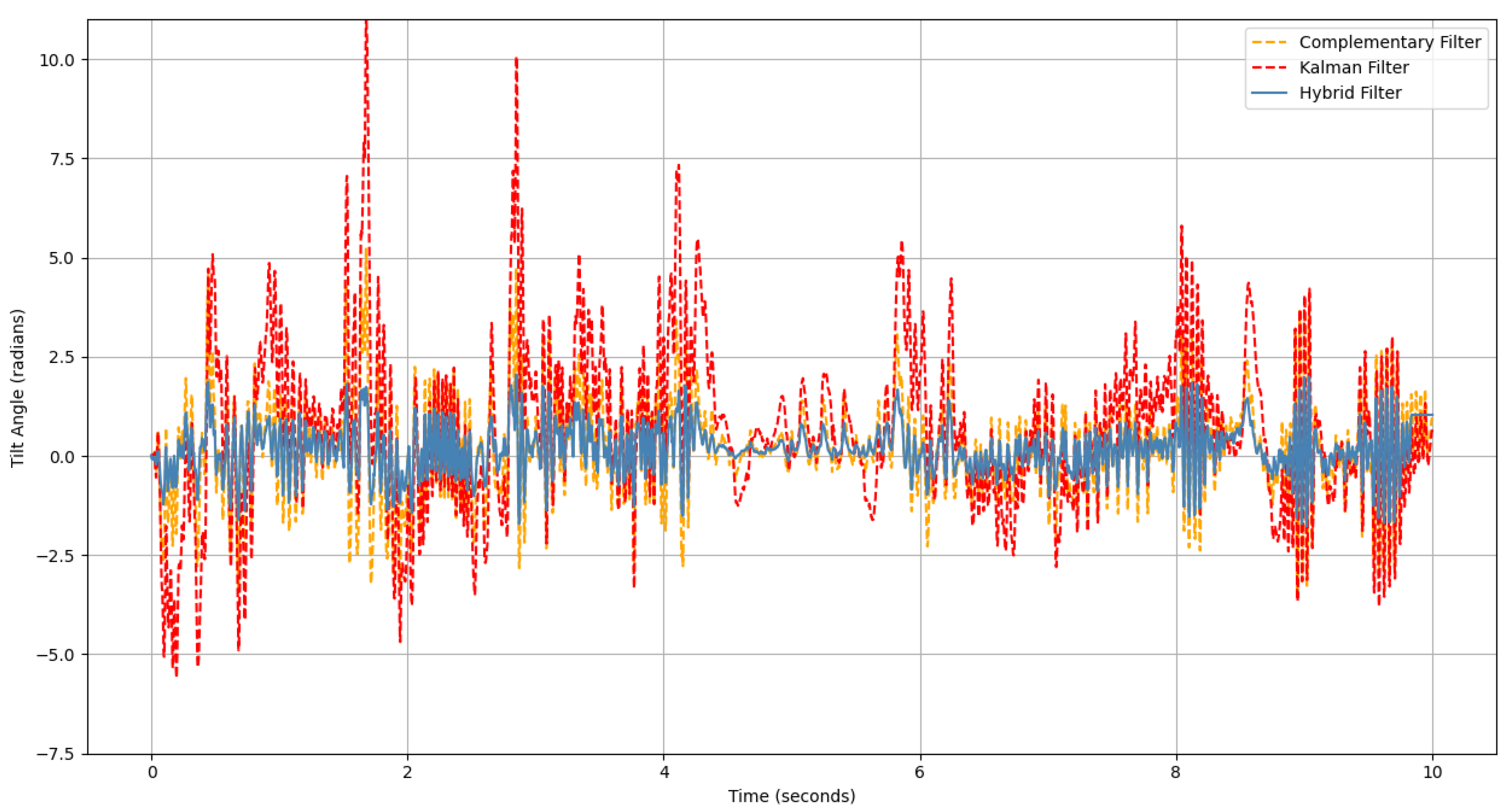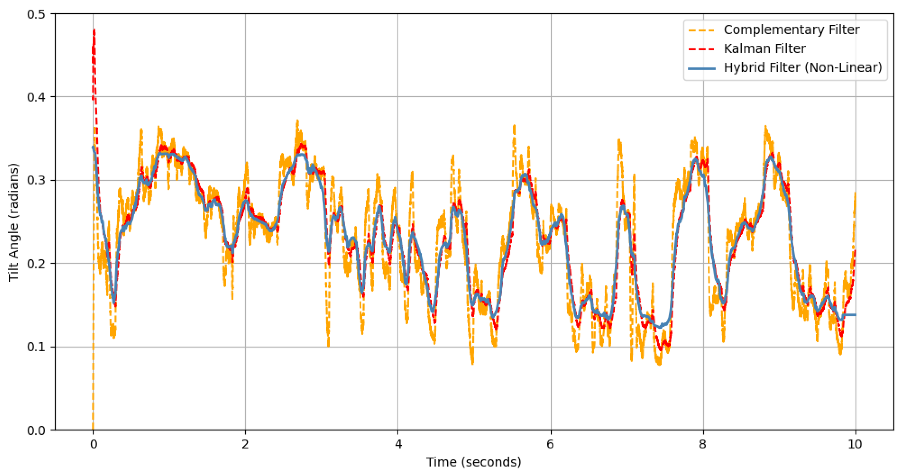For both datasets, the proposed hybrid sensor fusion approach produces smoother outputs than the complementary and Kalman filters, offering enhanced stability, robustness against noise, and improved signal refinement. Its ability to effectively mitigate noise while preserving system responsiveness highlights its advantage in reliable downstream processing.
