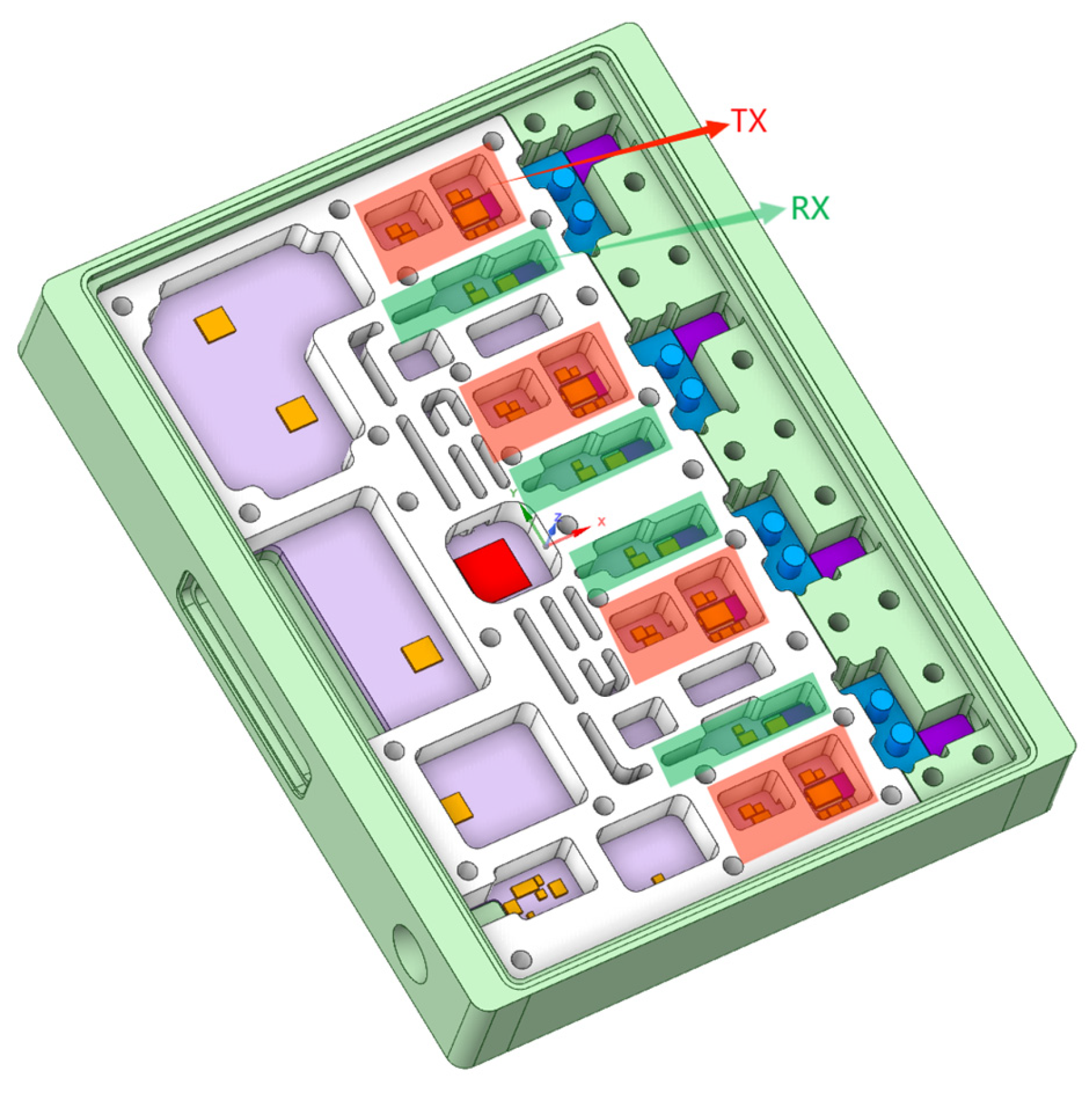 - Wang, Z.; Xiao, J.; Huang, J.; Yin, H.; Yang, Y.; Yan, B.; Zhao, B. An improved high-power X-band 4×4 tile-type LTCC T/R module based on liquid cooling micro-channels. In Proceedings of the 2019 IEEE MTT-S International Microwave Symposium (IMS), Boston, MA, USA, 2–7 June 2019; pp. 1042–1045. [Google Scholar]
