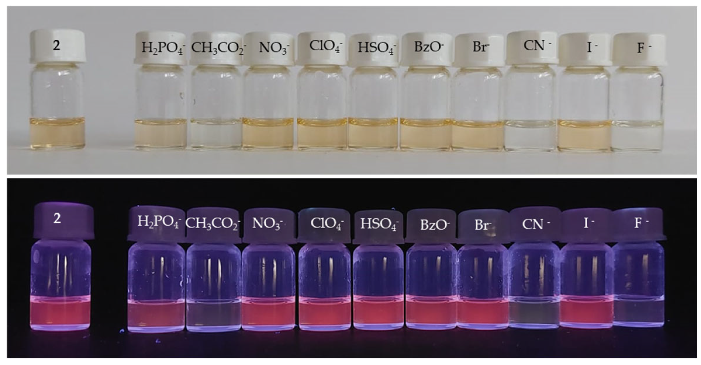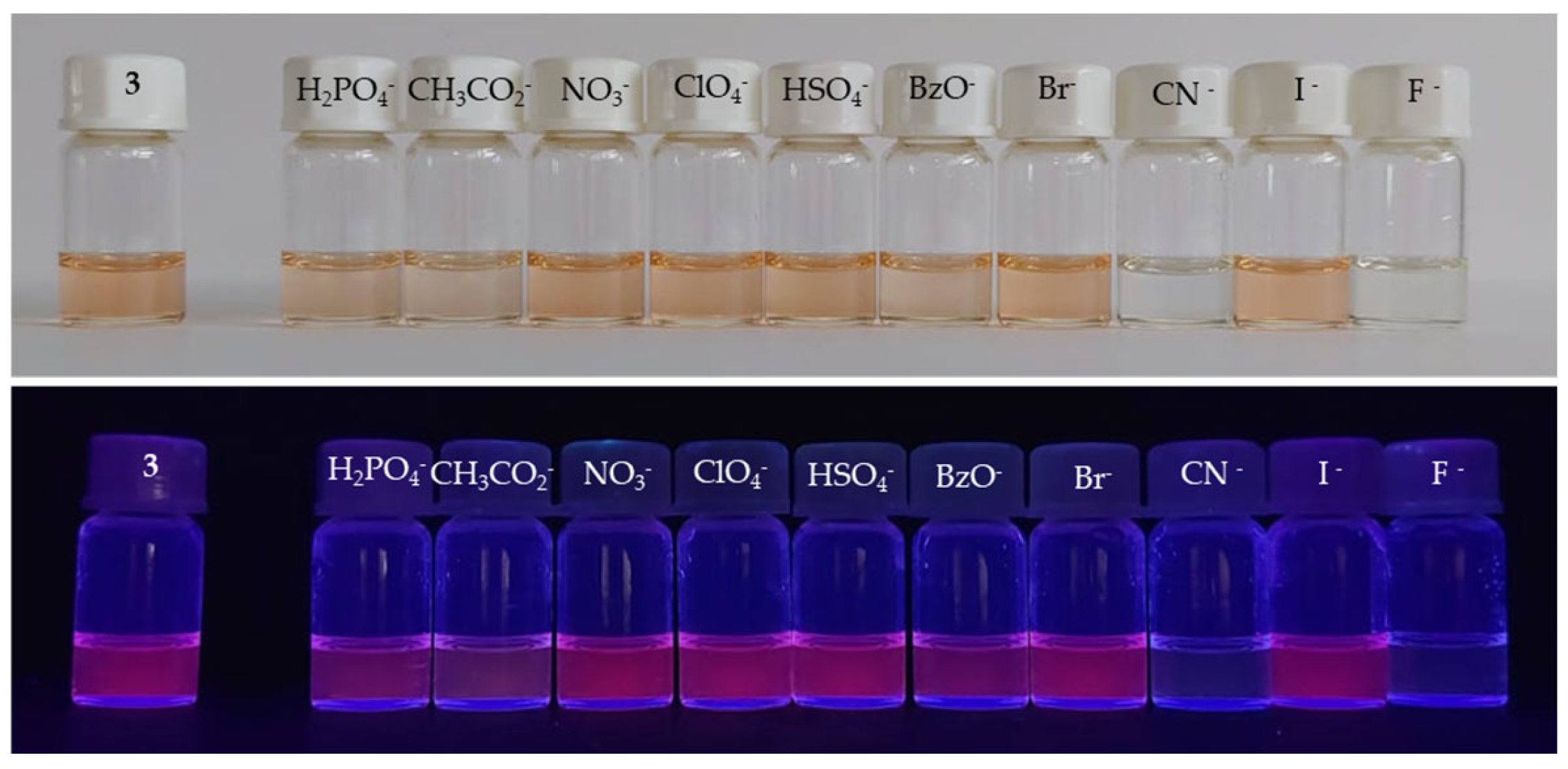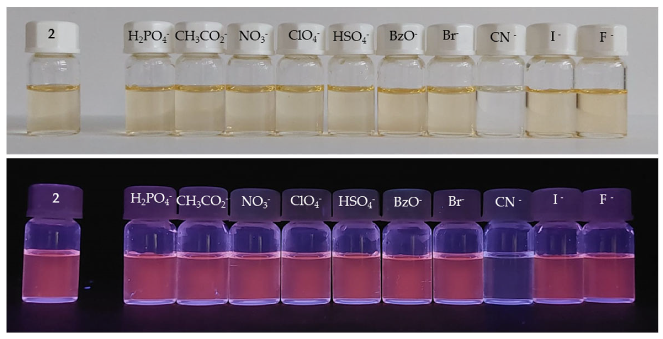 - Zhai, B.; Hu, Z.; Peng, C.; Liu, B.; Li, W.; Gao, C. Rational Design of a Colorimetric and Fluorescence Turn-on Chemosensor with Benzothiazolium Moiety for Cyanide Detection in Aqueous Solution. Spectrochim. Acta—Part A Mol. Biomol. Spectrosc. 2020, 224, 117409. [Google Scholar] [CrossRef] [PubMed]