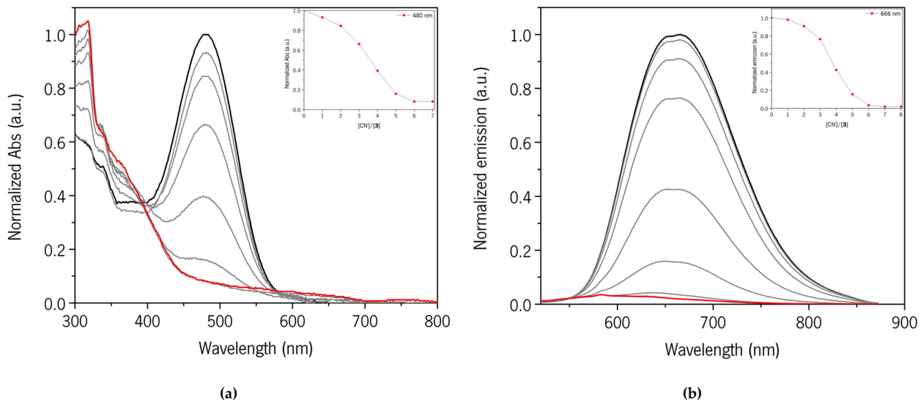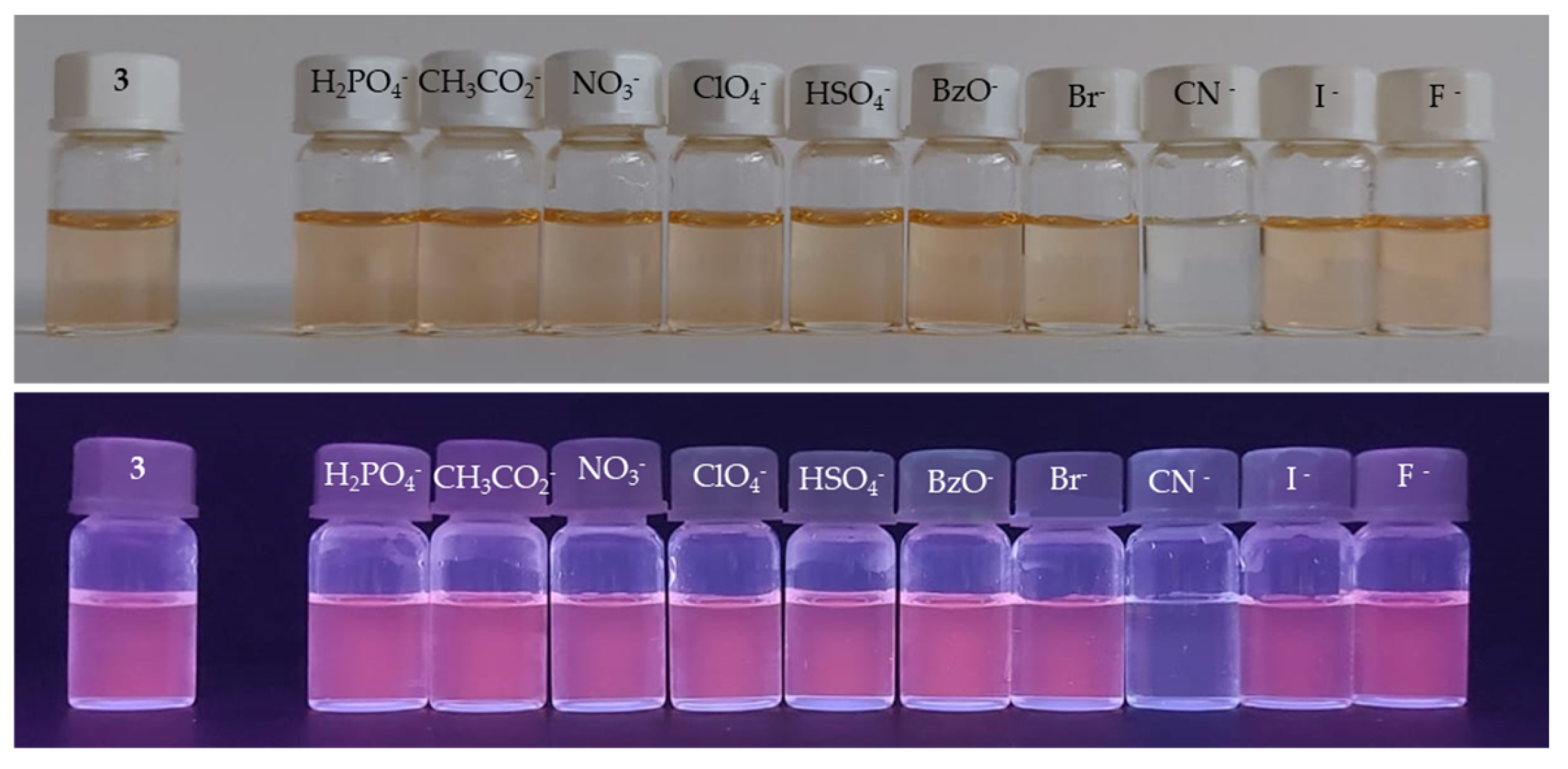 - Chao, J.; Li, Z.; Zhang, Y.; Huo, F.; Yin, C.; Liu, Y.; Li, Y.; Wang, J. A Single Fluorescent Probe for Multiple Analyte Sensing: Efficient and Selective Detection of CN−, HSO3− and Extremely Alkaline pH. J. Mater. Chem. B 2016, 4, 3703–3712. [Google Scholar] [CrossRef] [PubMed]