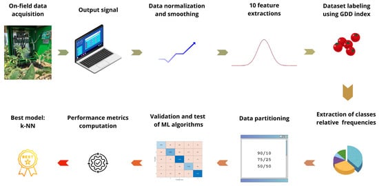 From 2020 to 2022, we conducted monitoring campaigns on processing tomato crops, typically from early June to early September. The campaign was a result of a collaboration with the agronomists of Canale Emiliano Romagnolo (CER), at their Acqua Campus, near Budrio (BO), Italy. A graphical representation of the data analysis workflow is depicted in Figure 1.