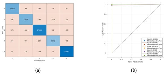 (a) Confusion Matrix (CM) and (b) ROC curves of the Fine k-NN model for the cumulative dataset, using 75%/25% train/test split. In the CM, darker blue tones along the diagonal indicate higher correct classification rates. In the ROC curves, the dotted line represents a random classifier (AUC = 0.5).
