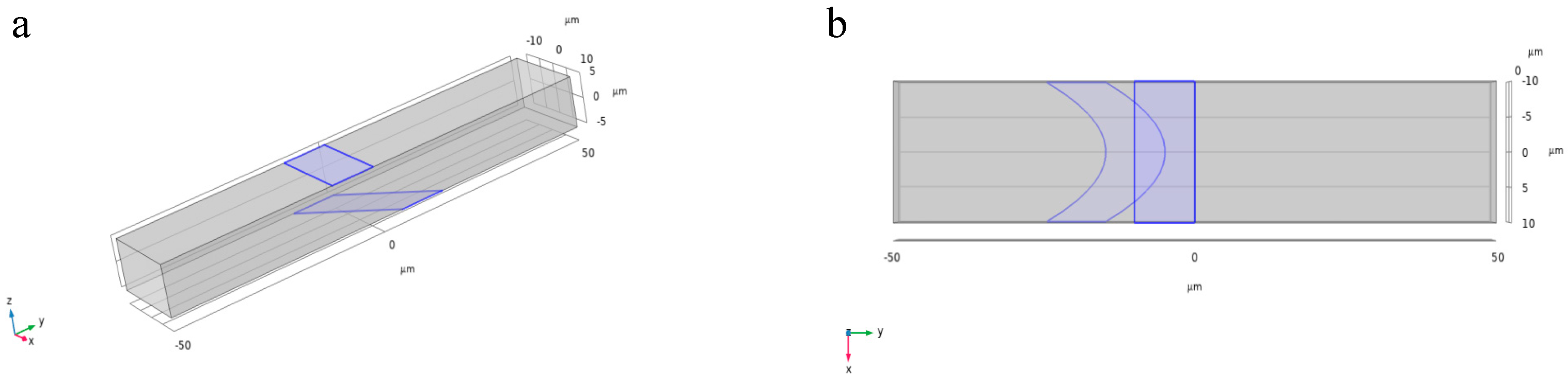 Modeling steps include geometry creation, material property assignment, boundary condition setup, and meshing. The microchannel was modeled as a rectangular channel of length 100–120 µm, width 10–20 µm, and height 10–15 µm. The surrounding fluid was assumed to be a conductive electrolyte with a conductivity of 1.44 S/m and a relative permittivity of 78.5 [