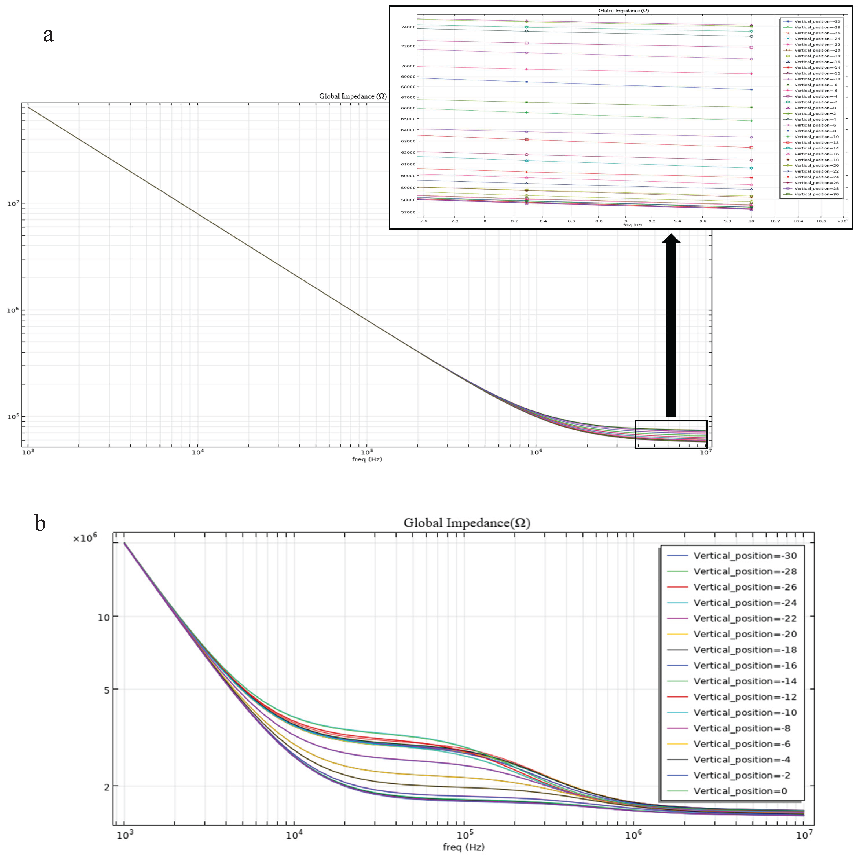 Impedance magnitude comparisons from the simulation results further corroborate these findings. Under identical simulation conditions, the impedance change generated by the parallel electrode layout when a cell passes through the electrode region (
