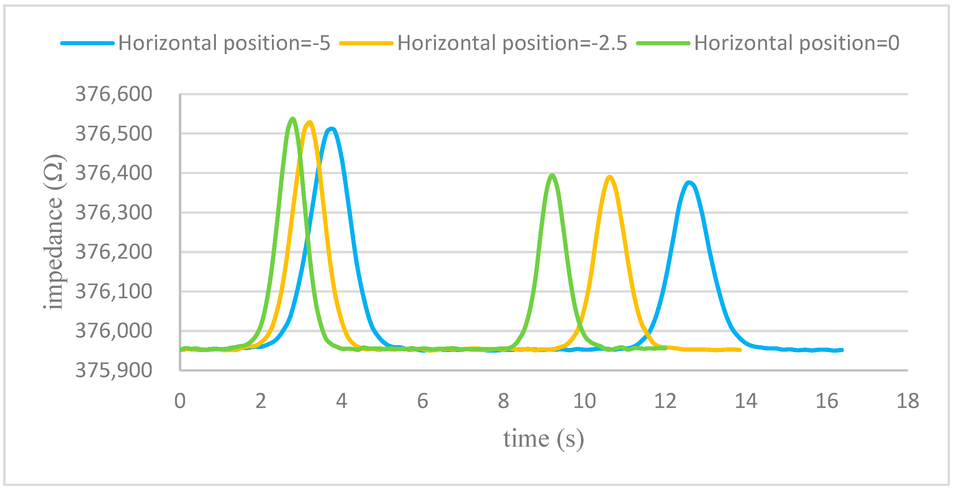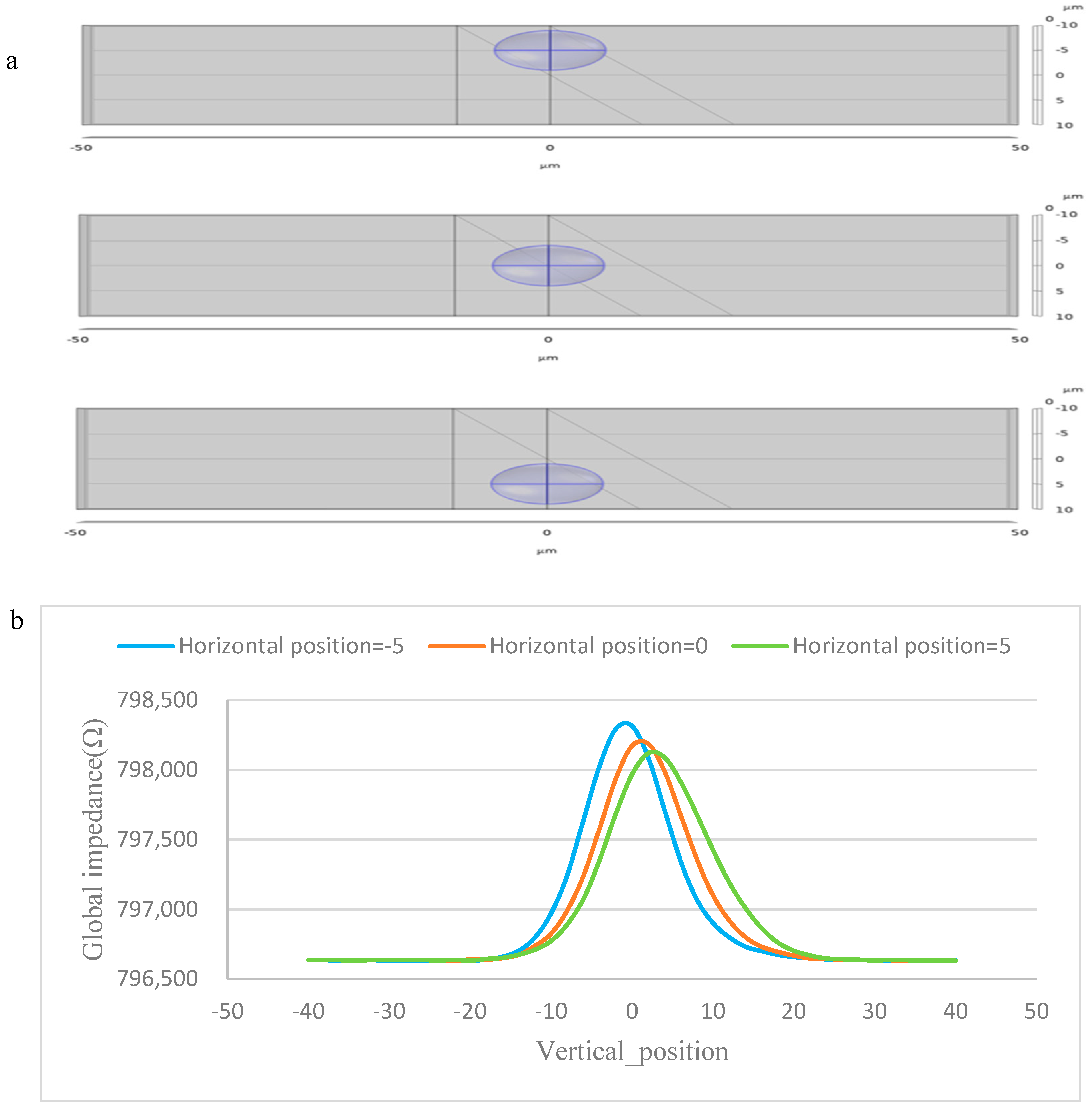 Figure 7a, the cells on the left side of the channel were exposed to the main electric field lines earlier, while the cells on the right side entered the strong electric field region later. This implies that the position of the impedance peak will shift depending on the lateral position of the cell.