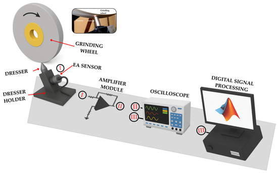 An acoustic emission (AE) sensor from Sensis (São Paulo, Brazil) was mounted on the dresser holder, and acoustic waves were collected during each dressing pass pass using a Yokogawa DL850 oscilloscope (São Paulo, Brazil) at a sampling frequency of 2 MHz. The DM42 amplifier module, also from Sensis, was used for signal conditioning and analog filtering through a low-pass filter set with a cutoff frequency of 400 kHz. Figure 1 illustrates the test bench used to perform the tests.