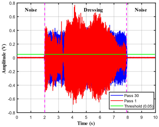 Digital signal processing was performed using Matlab® version R2024b. Initially, through a script, the data contained in the binary files corresponding to the acoustic signals collected by the oscilloscope during the dressing pass were converted into the double format, standard in MATLAB. Subsequently, for each pass, the portion of the signal corresponding to the dressing operation was extracted, since the original signal also includes noise regions at the beginning and end of the record. The AE signals corresponding to passes 1 and 30, as well as the noise regions and the 0.05 threshold used for the Counts statistic, are shown in Figure 2.