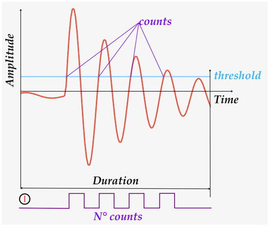 The statistical Counts method records the number of times the acoustic emission (AE) signal exceeds a given threshold within a specific time period. Figure 3 illustrates this process, in which the acoustic signal is compared to the continuous threshold signal, and each time the AE signal surpasses this threshold, an event count is generated at the rising edge.