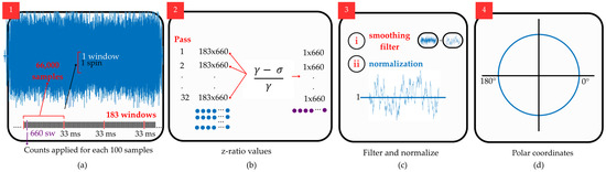 Steps for extracting features from AE signals: (a) Counts; (b) z-ratio; (c) Filtering and normalization; and (d) Polar coordinates.