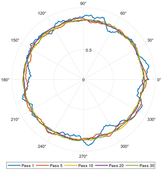 After calculating the z-ratio, a moving average filter with a window size of 15 points was applied to smooth high-frequency fluctuations and highlight signal trends. Subsequently, each vector was normalized by its mean to standardize the scale across different passes. These steps are illustrated in Figure 4c. Finally, in the stage shown in Figure 4d, the normalized vectors were converted into polar coordinates, and plots were generated to visualize the evolution of the dressing operation and thereby identify the grinding wheel’s eccentricity fault.
