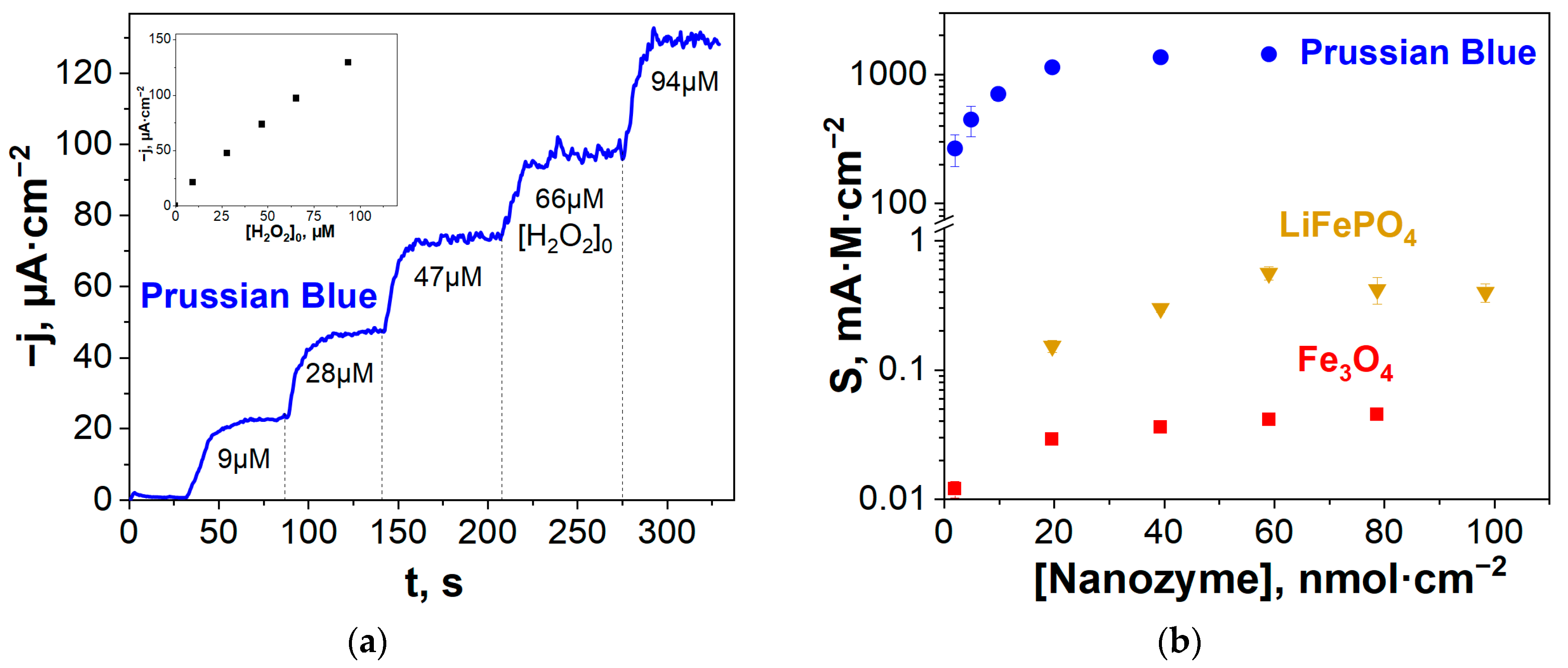 - Komkova, M.A.; Zarochintsev, A.A.; Karyakina, E.E.; Karyakin, A.A. Electrochemical and sensing properties of Prussian Blue based nanozymes “artificial peroxidase”. J. Electroanal. Chem. 2020, 872, 114048. [Google Scholar] [CrossRef]