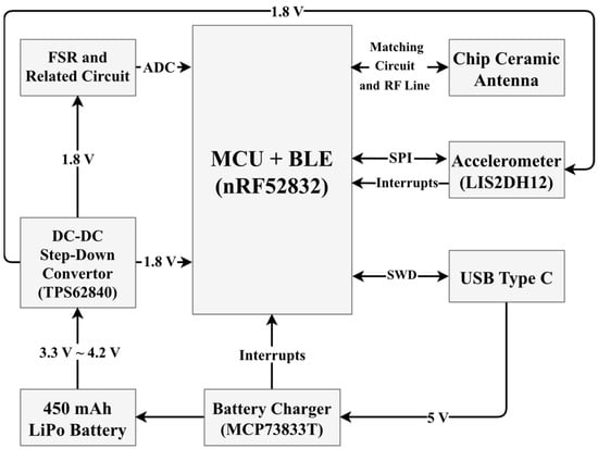 As depicted in the hardware diagram (Figure 2) and the assembled PCB layout (Figure 3), an ARM Cortex M4F processor and various peripherals, such as Bluetooth Low Energy (BLE) 5, are deployed [13]. Additionally, there is a USB type-C jack that is connected to the battery charger (MCP73833T) to charge a 450 mAh Lithium Polymer (LiPo) battery [14]. LiPo batteries can meet the needs of medical device applications due to their remarkable features like good cycle life, rechargeability, light weight, and high energy density [15]. It has an accelerometer (LIS2DH12) for detecting user motion [11]. A high-efficiency miniature DC-DC switching buck converter must be used to supply 1.8 V from the LiPo battery to the FSR, Micro-Controller Unit (MCU), and related circuits. TPS62840 is an excellent choice for this goal. It also has enough load capability [16].