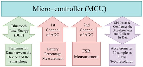 Firmware flowchart depicting the overall functionality. SPI configures the accelerometer. The first channel of ADC is used for the battery percentage measurement, and the second is for the FSR measurement. Also, the firmware is responsible for data transmission through BLE between the device and the smartphone.