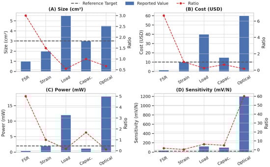 Comparison of five sensor types (Force-Sensing Resistor, strain gauge, load cell, capacitive force sensor, optical force sensor) across different metrics. Blue bars represent reported values. Black lines indicate reference targets suitable for wearable applications. Red lines show the ratio of reported to target values, where higher ratios imply better alignment with design goals.