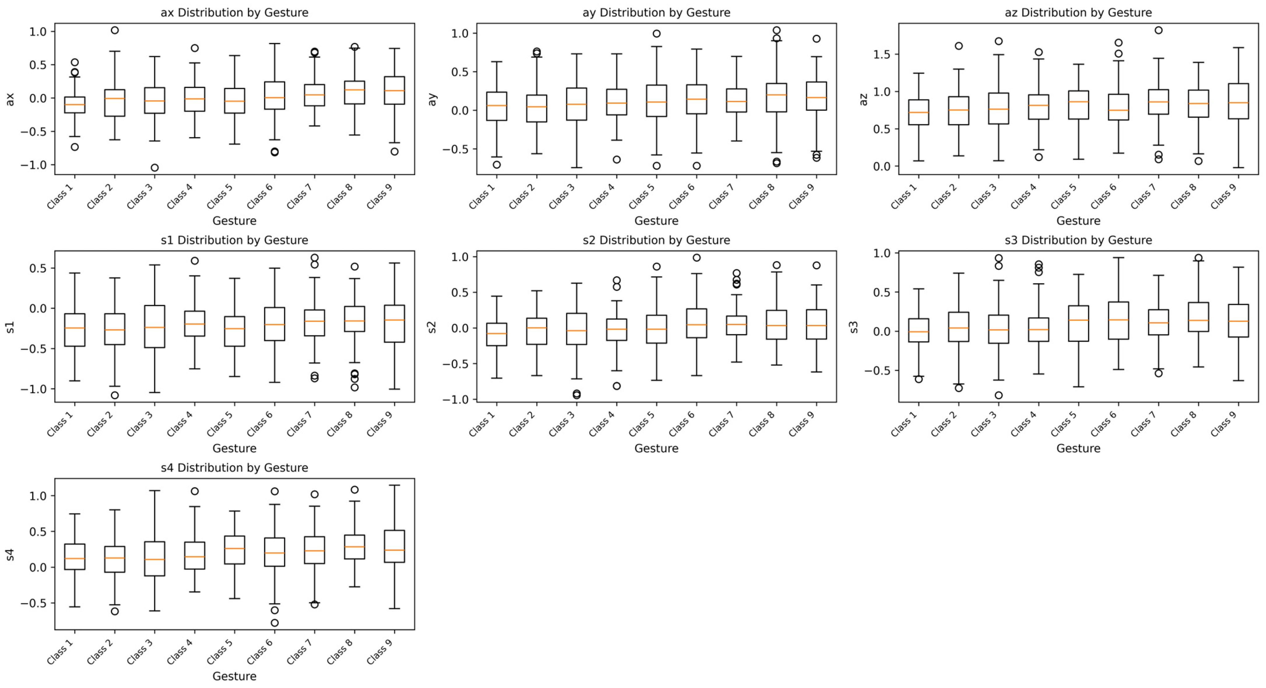 Figure 7 shows the accelerometer and flex sensor data-based PSL gesture class distribution. A box plot (sometimes called a box-and-whisker plot) uses five summary statistics—minimum, first quartile (Q1), median, third quartile (Q3), and maximum—to show the data distribution and symmetry. The central box contains the interquartile range (IQR), the middle 50% of the data, from Q1 to Q3. The smallest and greatest values within 1.5 times the IQR are “whiskers”; data points beyond this range are outliers.