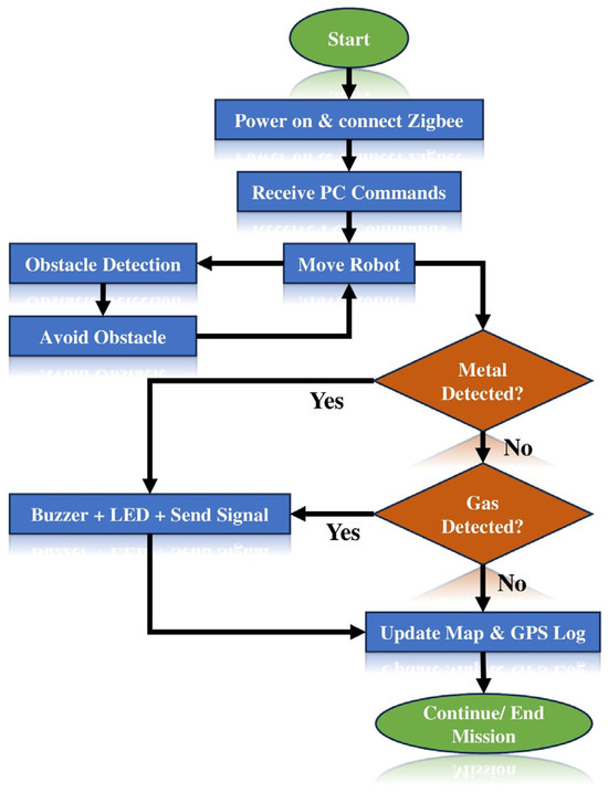 A landmine-detecting robot is essential in peacekeeping operations and for decontaminating regions affected by explosives. This method aims to enhance operator safety by enabling remote operation and precise threat detection, eliminating the need for direct human contact with hazardous areas. The proposed robot is operated remotely using a computer interface utilising a Zigbee communication module (Macfos LTD, Pune, India), facilitating long-range, low-latency control. The system’s foundation is an Arduino UNO microcontroller (Macfos LTD, Pune, India), which orchestrates and interprets data from all integrated modules. The robot incorporates an ultrasonic sensor (Erh India, Valsad, India) for obstacle identification, ensuring safe and efficient navigation by preventing collisions with objects or irregular terrain. A GPS module (Robocraze Bengaluru, India) delivers accurate location data in latitude and longitude, enabling operators to document and designate the specific locations of identified landmines for methodical removal. A metal detector (Robocraze, Bengaluru, India) is utilised to detect subterranean metallic landmines. Upon detecting a possible danger, the Arduino activates a buzzer to provide immediate audible alarms, while simultaneously notifying the operator through the PC interface. The robot’s body is composed of resilient materials designed to endure minor explosion impacts, providing a degree of physical protection for its components. The robot employs high-torque DC motors (Robocraze, Bengaluru, India), driven by an H-bridge motor driver circuit, allowing seamless multi-directional mobility across uneven terrain. All components are affixed to a small chassis and energised by a specialised power supply unit. The PC monitoring station manages navigation and presents detection data and GPS coordinates to accurately map mine placements on the map accurately. This cohesive methodology ensures that real-time detection, navigation, and position monitoring are effectively managed, making the system a dependable and secure option for hazardous field activities. The workflow of the suggested model is depicted in Figure 1.