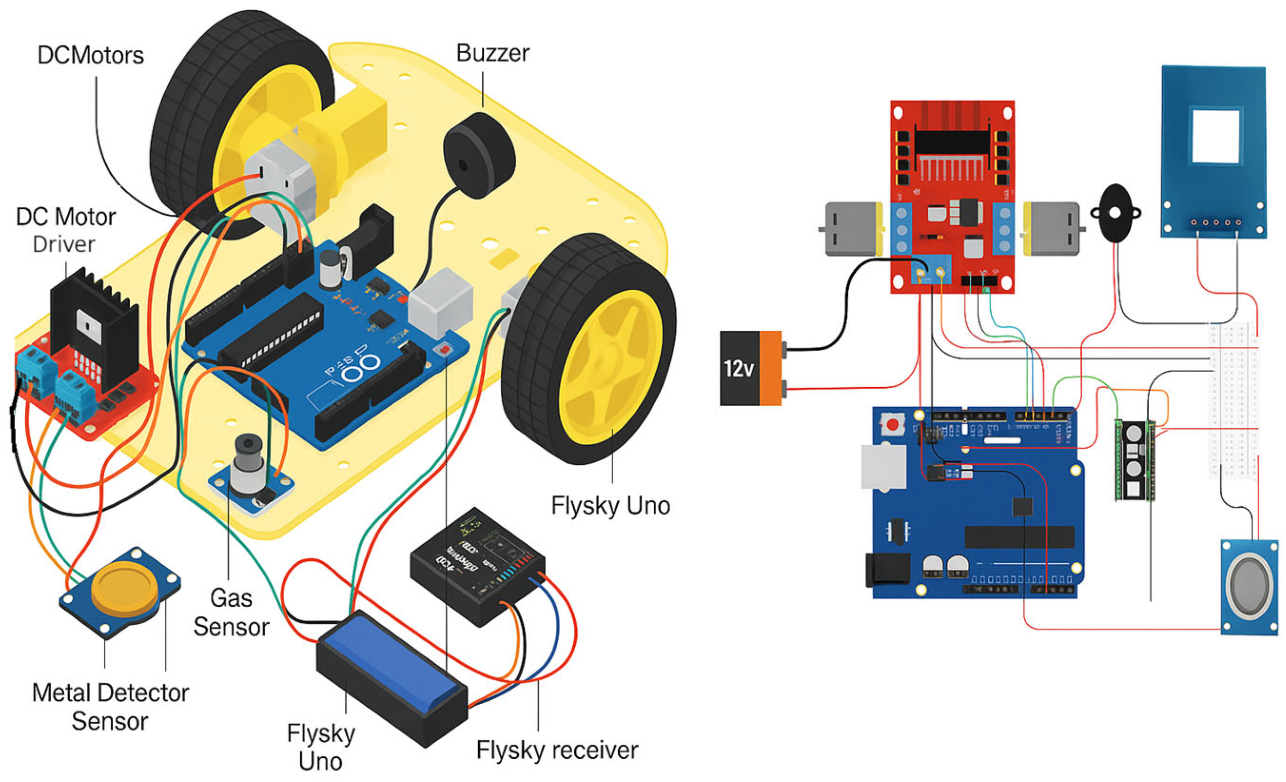 The novelty of this work introduces a low-cost, portable robot that detects both buried metallic objects and hazardous gases in real time. It integrates multiple functions—metal detection, gas sensing, obstacle avoidance, and mapping—into a single wireless-controlled platform. An autonomous safety system halts movement and triggers alarms upon detecting a threat, thereby improving safety over manual methods. The schematic of the working model used in the experiment, along with the corresponding circuit connection diagrams, is shown in Figure 2.