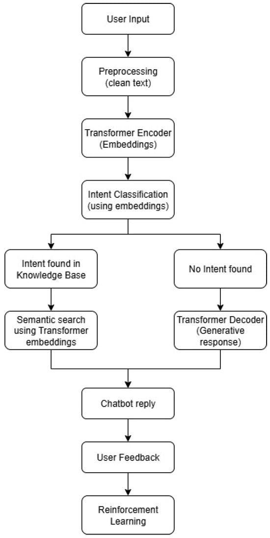 A transformer is a neural network design that converts text into numerical representations called tokens. It is based on the multi-head attention mechanism. After that, each token is converted into a vector by searching for it in a word embedding table. Each layer then contextualises each token with other (unmasked) tokens within the context window using a concurrent multi-head attention approach, increasing the signal for important tokens and decreasing it for less important ones. Figure 2 shows the process flow that involves transformers and illustrates what happens when an intent is found in the knowledge base (KB), as well as when no intent is found, which then triggers the transformer-decoder to generate a response.