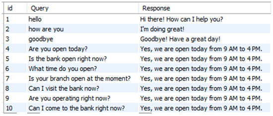 This section presents the chatbot system’s performance results. The database was designed for the banking system, where clients enquire about the bank being open for business or operating for the day. The sample of what exists in the database is shown in Figure 3.