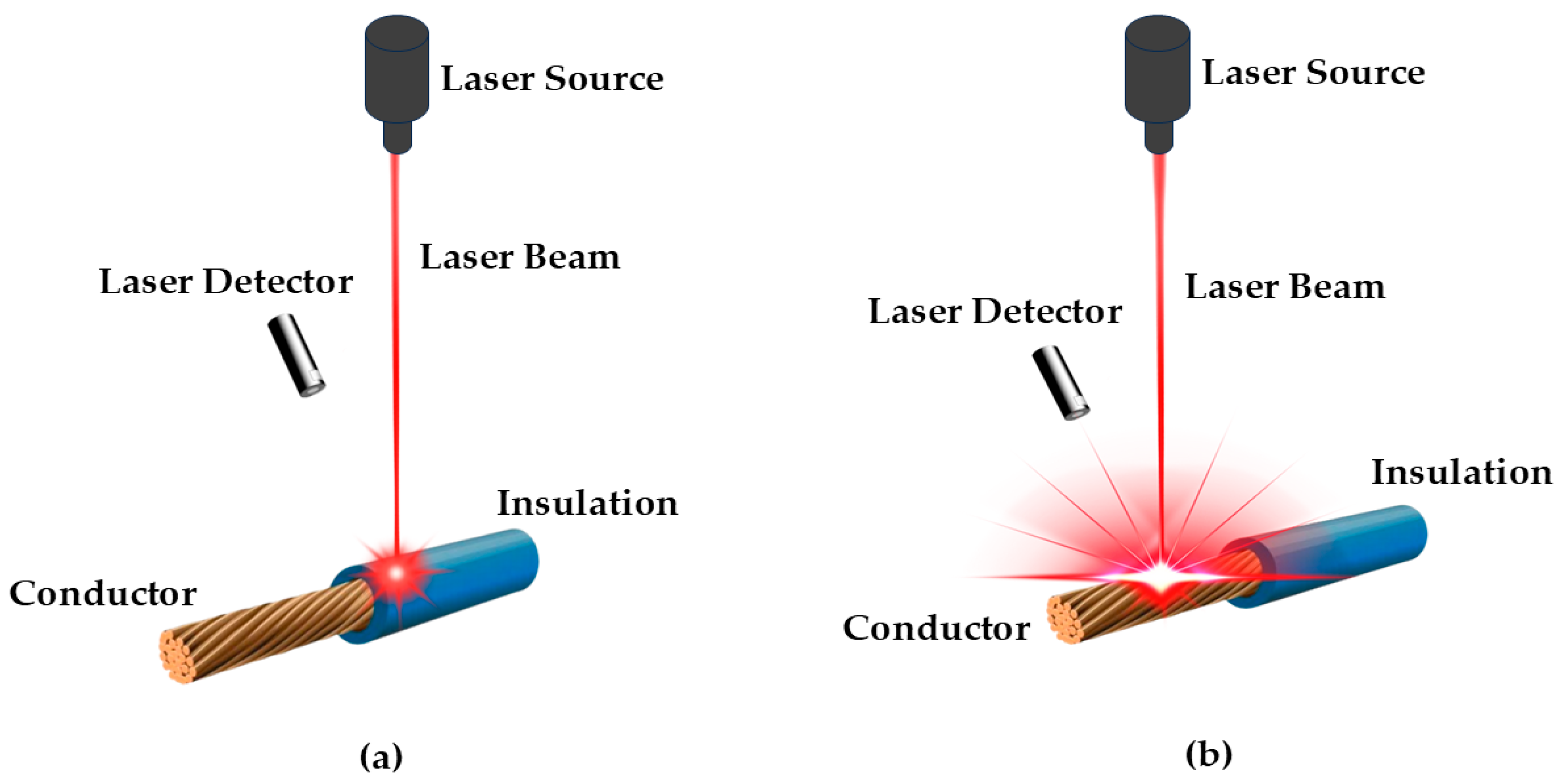 Figure 1. Laser beam interaction in the detection system: (a) Schematic showing the interaction of the laser beam with the insulation and the detection process; (b) Illustration of how the laser beam contacts copper and how the laser detector detects the reflected signal.