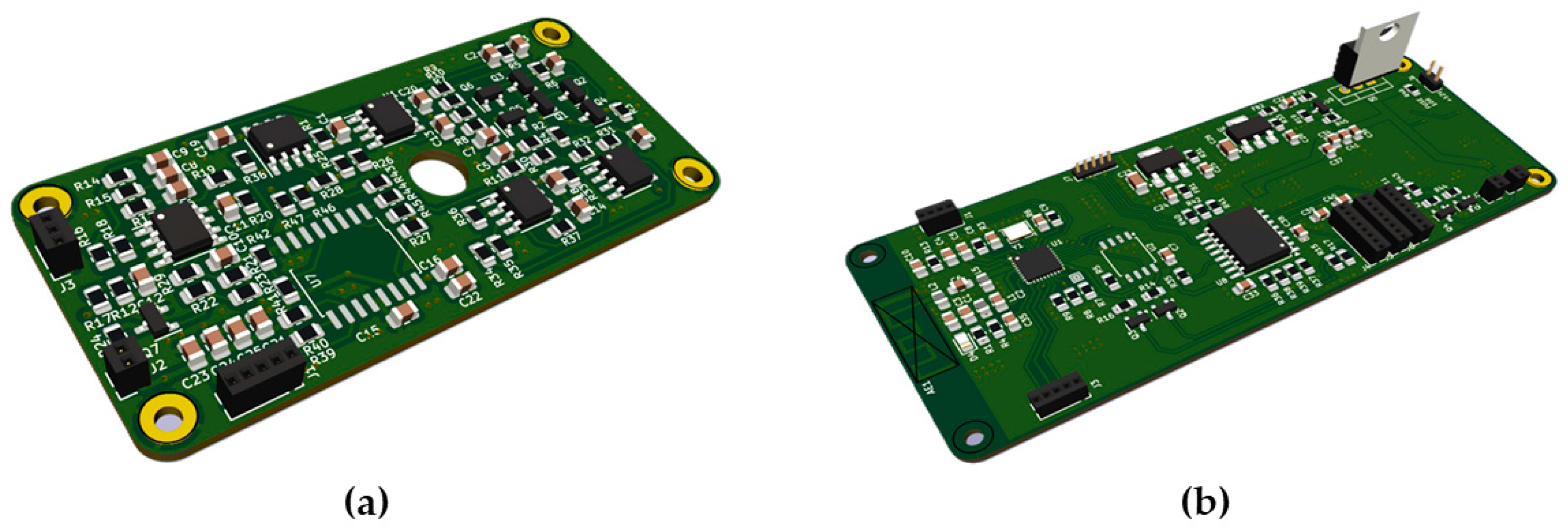 Figure 3. (a) Sensor PCB of the detection system responsible for capturing optical signals; (b) Main PCB handling signal processing, including synchronous demodulation, filtering, and microcontroller control.