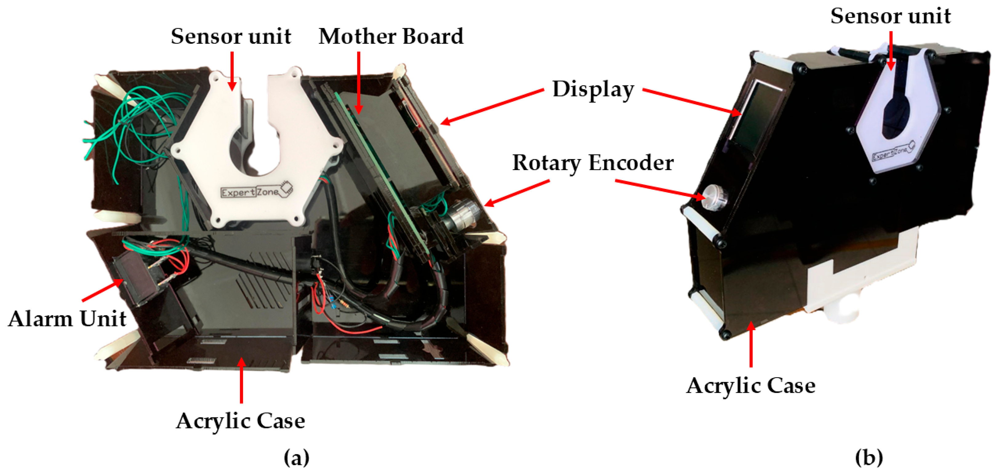 Figure 4. Fully assembled wire sheath damage detection system. (a) Internal view (cross-section) showing the arrangement and labelling of major components. (b) External view of the complete system, illustrating its integration of all components.