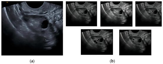 Demonstration of synthetic dataset creation: (a) base transvaginal image used for synthesis; (b) derived class images (active, inactive, declining, perimenopausal, and anomalous).
