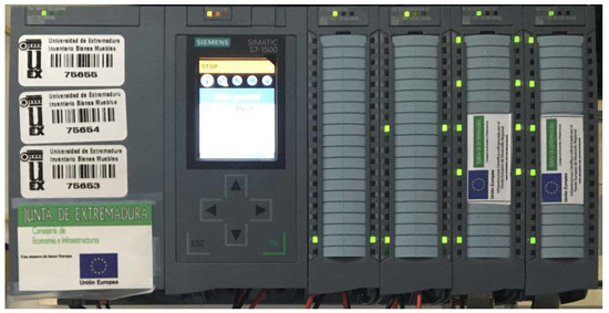 This is a distributed control system, orchestrated around an industrial PROFINET communication network, which consists of three programmable logic controllers (PLCs) with identical CPU specifications and their associated distributed peripherals. All manufactured materials utilized in this study were sourced and produced in Madrid, Spain, in accordance with applicable industrial and quality standards. In this project, SIMATIC S7-1500 PLCs have been used. Specifically, the SIEMENS CPU 1516-3 PN/DP, (reference “6ES7516-3AN01-0AB0”) has been employed.