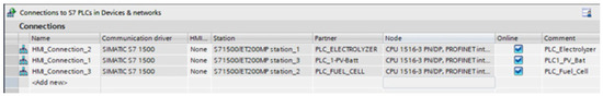 Although the TP700 operator panel is physically installed in a different room than the PLC responsible for managing the generator, it was deemed appropriate to enable access to all the PLCs that make up the SMG automation and management system from the HMI interface. Figure 5 shows the configuration of the established connections to the PLCs for accessing the variables stored therein.