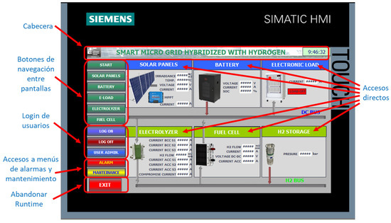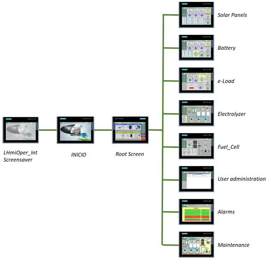A dynamic and user-friendly interface has been designed to facilitate understanding of the SMG’s operation, including the internal visualization of each subsystem and the evolution of energy and hydrogen flows through the SMG. Since it is a complex system involving several processes, different screens have been defined within the same application, each with its own synoptics, active areas, and associated variables. The transition from one screen to another is carried out in an orderly manner by the operator through buttons activated by a graphical cursor linked to the mouse or by buttons on the screen to view the process evolution. Figure 6 shows the developed navigation scheme between screens.