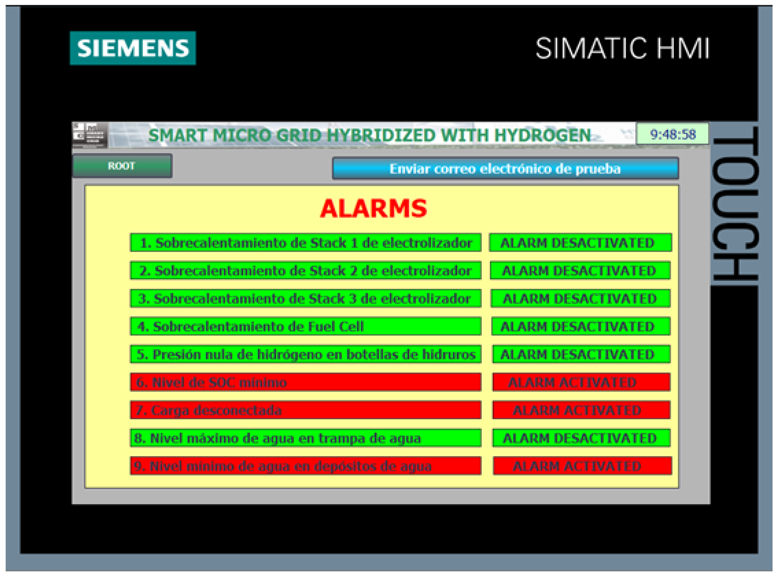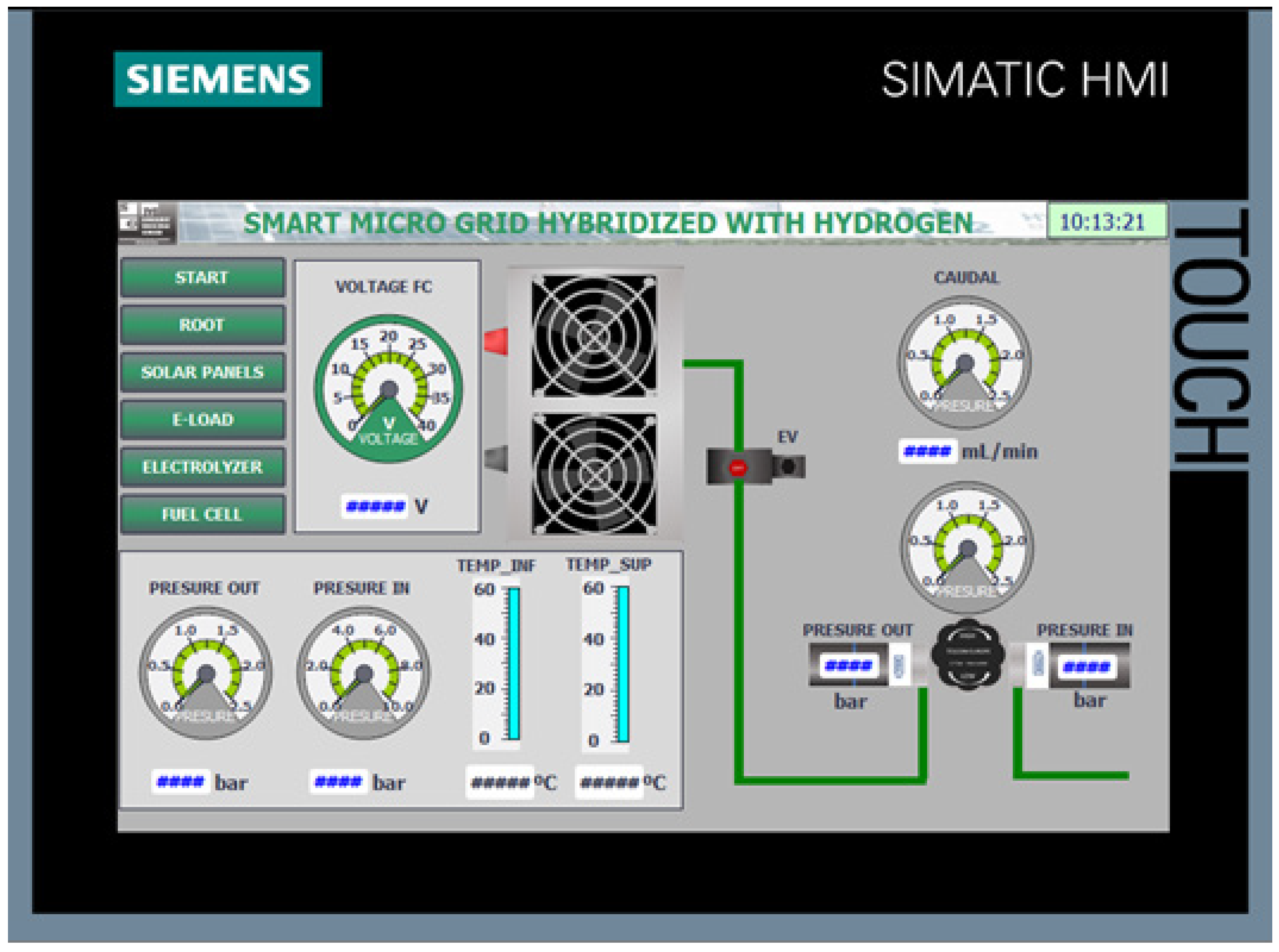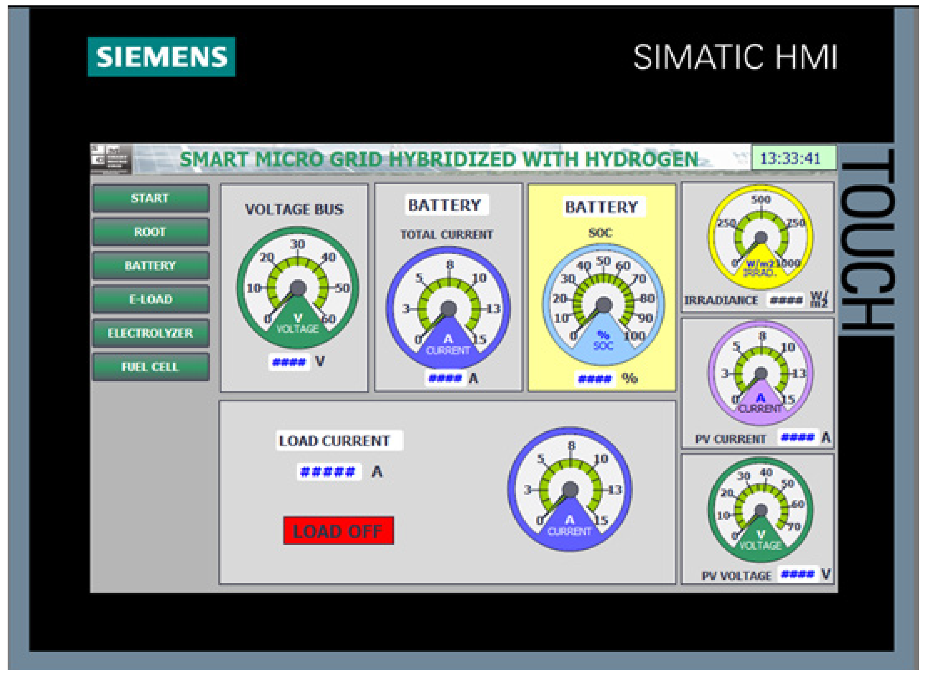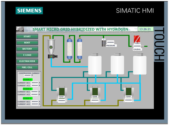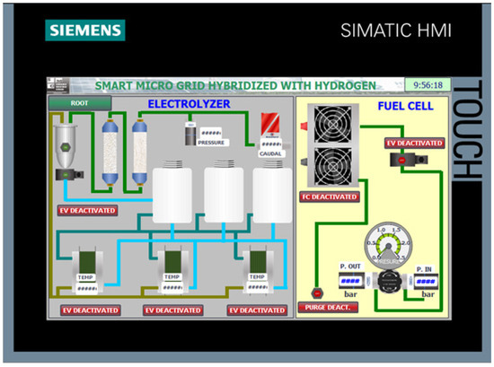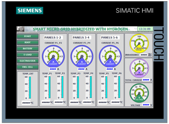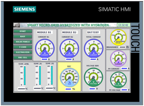 The implementation of the HMI screens on the Siemens KTP700 panel, programmed using TIA Portal, has enabled an effective human–machine interface tailored for the control and monitoring of the smart micro-grid components. The development included a startup screen, user authentication confirmation, a main overview screen, and specialized screens for the electrolyzer, hydrogen fuel cell, and solar energy variables.