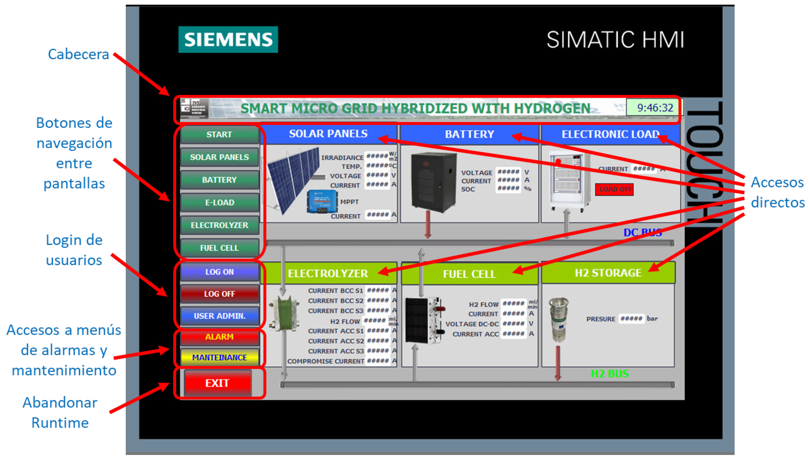 Figure 7, the screen is divided into 6 distinct sections in several independent blocks for direct access to each subsystem. Additionally, to provide a more intuitive identification of the overall status of the SMG, arrows have been included in the synoptic diagram connected to the electric and hydrogen buses to indicate the active flows and their direction. The buses are always shown as active, and the arrows are displayed depending on the conditions of the electrical energy or H2 flows.