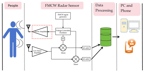 Figure 1 shows a wireless sensor network system for physiological monitoring. In this system, the RF front end uses a voltage-controlled oscillator (VCO) to generate an FMCW signal, which is then amplified by a power amplifier (PA) and transmitted by the transmit antenna. The target reflection signal is received by the receiving antenna and transmitted to the low-noise amplifier (LNA). Subsequently, the amplified signal is mixed with the original LO signal to generate an intermediate frequency (IF) signal, which is then sampled by the ADC and sent to the data processing center, ultimately transmitted to the PC.
