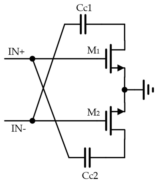 In the millimeter-wave frequency band, the gate-drain parasitic capacitance Cgd significantly increases and cannot be ignored. The presence of Cgd creates a feedback loop between the gate and drain of the transistor, thereby reducing the maximum stable gain of the amplifier and degrading its stability and reverse isolation. To address this issue, cross-coupled neutralizing capacitance technology can be introduced into the differential amplifier, which is shown in Figure 4. A neutralizing capacitance Cc is connected between the gate of the transistor and the drain of its differential transistor. When the neutralizing capacitance Cc is equal in magnitude to the gate-drain capacitance Cgd, stability and reverse isolation are optimal. This technique not only enhances the stability of the PA and reduces the risk of self-oscillation but also ensures that the gain of each amplifier stage remains relatively independent. It isolates the impact of the matching pair in the subsequent amplifier stage on the preceding stage, thereby simplifying the overall amplifier design.