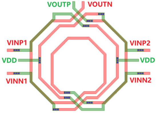 Due to the limitations of the CMOS process, it is still difficult to achieve a large output power in the millimeter-wave band with a single amplifier, and at this point, multiple amplifiers can be considered for power synthesis. Theoretically, doubling the number of synthesized circuits can increase the output power by 3 dB, but in practice, too many circuits will increase the loss of the synthesis network, and at the same time, the electromagnetic coupling of the synthesis network becomes more complicated, which reduces the synthesis gain significantly. Therefore, in this design, only a two-channel parallel synthesizer is used. In order to make the load impedance at the drain terminals of the two amplifiers highly consistent, reduce signal mismatch and improve the power synthesis effect. This paper designs a highly symmetrical transformer. The layout structure is shown in Figure 6.