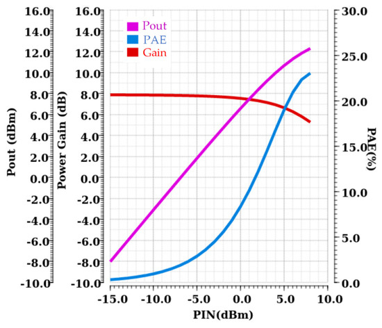 We input a 19 G signal range from −15 dBm to 8 dBm and obtain a series of outputs from PA. Figure 8 shows the output power, the power gain, and PAE. The pink line is the output power, the red line is the power gain, and the blue line is PAE. The broadband PA achieves a saturated output power of 12.3 dBm with 23% PAE, and a 1 dB compression point of 10.15 dBm with 17.2 PAE.