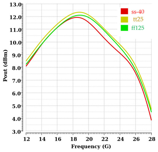 The wider the bandwidth of the PA, the higher the resolution of millimeter-wave radar, and the more accurate the detection of chest cavity movement will be. We set the frequency or input signal range from 12 G to 28 G. And we obtain a 3 dB bandwidth of the PA up to 62% from 13 G to 24.8 G. Figure 9 shows the Psat as a function of frequency under different process corner and temperatures. Table 1 compares the PA designed in this paper with related published papers.