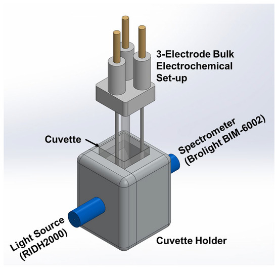 Cyclic voltammetry and in situ absorbance measurements were carried out using a customized portable set-up comprising (i) a three-electrode bulk electrochemical set-up and Precision Source/Measure Unit (Keysight B2902, Keysight Technologies, Santa Rosa, CA, USA) as the electrochemical platform, (ii) a spectroelectrochemical cell integrated with collimating lenses, (iii) a light source (RIDH2000, Hangzhou Brolight Technology Co., Ltd. (Brolight Tech), Hangzhou, China), and (iv) spectrophotometer (Brolight BIM-6002, RI Instruments & Innovation India (RI Group), Haldwani, India). The light source was positioned parallel to the electrode, introducing a beam that passed through the analyte solution and reached the detector, as shown in Figure 1. Customized disposable cuvettes with a path length of 1.0 cm and volume of 1 mL were used for all experiments.