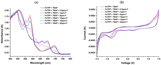 (a) Absorbance spectra; (b) IV spectra of 5,10,15,20−tetraphenyl−21H,23H−porphine iron (III) chloride (FeTPP) for varying concentrations of fluoride from 0.5 ppm to 20 ppm.