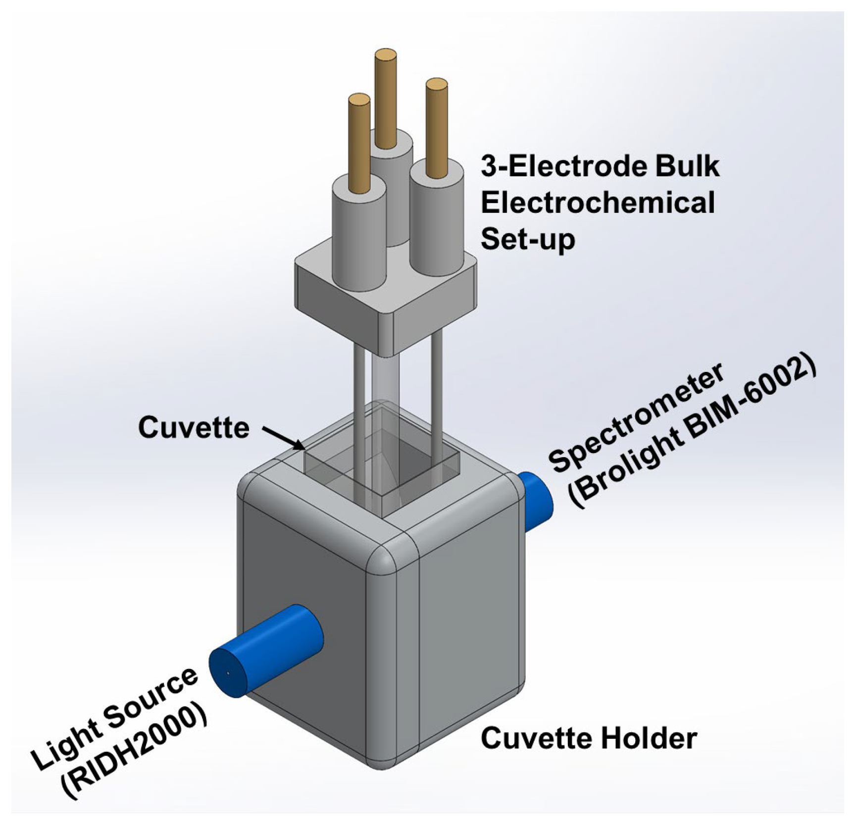 Cyclic voltammetry and in situ absorbance measurements were carried out using a customized portable set-up comprising (i) a three-electrode bulk electrochemical set-up and Precision Source/Measure Unit (Keysight B2902, Keysight Technologies, Santa Rosa, CA, USA) as the electrochemical platform, (ii) a spectroelectrochemical cell integrated with collimating lenses, (iii) a light source (RIDH2000, Hangzhou Brolight Technology Co., Ltd. (Brolight Tech), Hangzhou, China), and (iv) spectrophotometer (Brolight BIM-6002, RI Instruments & Innovation India (RI Group), Haldwani, India). The light source was positioned parallel to the electrode, introducing a beam that passed through the analyte solution and reached the detector, as shown in